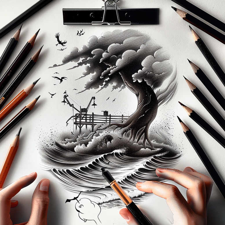 This concept presents a Japanese-inspired tattoo design featuring a dragon riding a curling, lacquer-black wave, with a pagoda perched on a rocky island and distant birds sketched in atmospheric greys. The image is rendered in black and grey, using fine line technique to create crisp outlines and subtle shading that gives depth to the cresting wave and the dragon’s sinuous form. Central to the composition is the dragon, a symbol of wisdom, power and resilience, entwined with the sea to evoke constant motion and the ever-changing tides of life. A pagoda provides a cultural anchor, suggesting a journey or sanctuary, while the island setting adds a sense of isolation and focus. The birds in the distance offer a sense of freedom and perspective, balancing the dense focal motifs. This tattoo design suits large areas where negative space defines breathing room, yet the overall piece can be adapted into a smaller work with careful scaling. The brushwork and line work convey a traditional Japanese style while embracing modern ink techniques, including light shading and fine-line detailing for a clean, legible tattoo design. The piece is intended as a meaningful tattoo concept for those seeking a protective emblem of strength and serenity, and every element can be adjusted for personal symbolism—dragon for power, wave for change, pagoda for balance, island for solitude, birds for flight. Note: this is an AI-generated tattoo project concept, ideal for experimentation and a potential cover-up due to its dense dark lines; the design can be refashioned into a more restrained black and grey piece or expanded into a full back piece depending on client needs. Keywords: tattoo, tattoo design, meaningful tattoos, fine line tattoo, lotus flower tattoo, infinity tattoo, tribal tattoo, rose tattoo design, small tattoos, flower tattoos, custom tattoo design, Japanese style tattoo, black and grey, realistic tattoo, body art, ink.