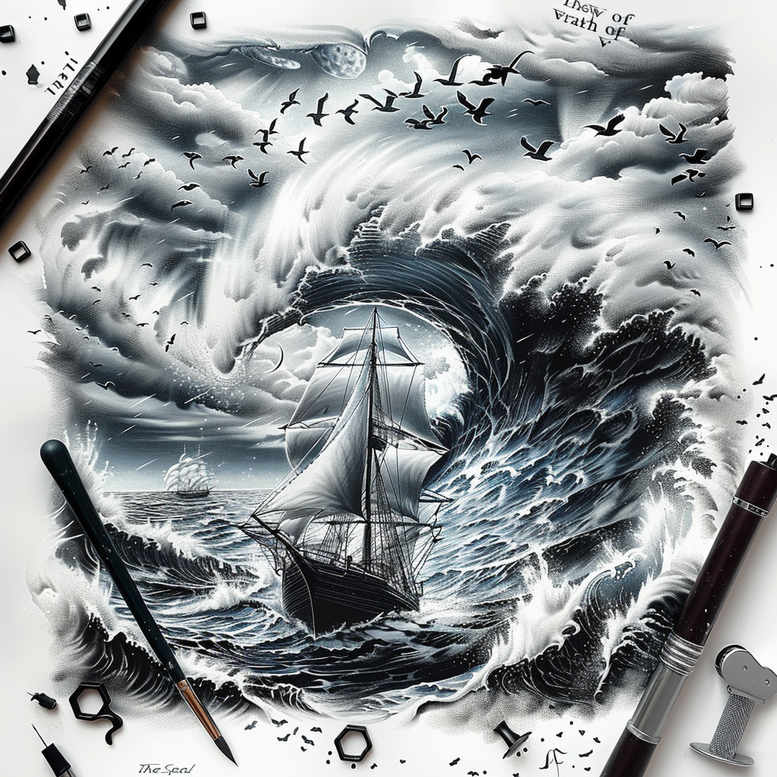 This AI-generated tattoo project presents a dramatic storm-inspired seascape rendered in black and grey with a central ship braving a towering wave and encircled by a curling whirlpool. The composition uses a circular motif formed by the waves to create a dynamic frame, while the rigging and hull details are treated with fine line precision to achieve a realistic tattoo effect. The shading transitions from deep charcoal shadows to lighter grey gradients, allowing the ship and spray to pop against a misty background. The surrounding whirlpool and crashing surf introduce a graphic pattern that reinforces movement and energy without overpowering the main subject. The piece reads as a narrative of voyage, resilience, and courage, turning a perilous moment into a meaningful tattoo design that suits sleeve, back, or chest placements. It’s also a strong choice for cover-up since the dense blacks and layered shading can effectively mask existing ink. In terms of symbolism, the ship represents perseverance in the face of storms; the sea embodies life’s unpredictable currents; the circular swirl evokes infinity and cycles, while the restrained palette ensures versatility across skin tones. From a technique perspective, this black and grey composition blends realism with graphic linework, employing smooth transitions, crisp edges for the ship rigging, and subtle cloud textures to add depth, all aligned with current trends in Japanese style tattoo and traditional nautical tattoo motifs. As an AI-generated tattoo project, it demonstrates how modern design can fuse classic themes—such as the rose tattoo design and flower tattoos motifs echoed in the wave patterns—into a cohesive, custom tattoo design suitable for meaningful tattoos, ink-rich body art, and a refined, bold statement. Applied techniques emphasize layering, edge crispness, and soft gradations to achieve a breathable yet dense feel suitable for larger areas or sleeves. The design translates well into a small tattoo design as well if scaled; conversely it can saturate a back or chest canvas for maximum impact. The concept also suits meaningful tattoos with themes of resilience, voyage, and freedom, and its monochrome palette ensures longevity. As an AI-generated tattoo project, this concept demonstrates how algorithmic creativity can inform custom tattoo design workflows, enabling variations in size, line weight, and pattern density while preserving core symbolism.