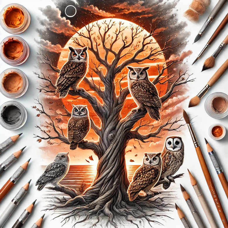 This AI-generated tattoo project presents a nature-focused concept designed for a dexterous black and grey fine line tattoo with a warm orange sun. The central motif is a mature tree with branching limbs that cradle a quartet of owls, each rendered with delicate line work to convey wise, watchful presence. Behind the tree, a glowing circular sun casts a soft halo, its orange pigment offering a striking contrast to the monochrome tree and birds. Surrounding the composition are tools of the tattoo artist’s trade—brushes, ink cups, and a sheet of paper—evidence of the design’s origin as a studio concept and its readiness for refinement into a final piece. The scene is balanced to allow generous negative space, enabling careful shading and line weight transitions that are essential in fine line tattoo practice. Symbolically, owls evoke wisdom and nocturnal vigilance; the tree stands for life and endurance, while the sunrise hints at renewal and new chapters. In Japanese style tattoo influence, this arrangement can be adapted to flow as a sleeve or back piece, but in its current form it works well as a standalone small-to-medium design suitable for placement on the forearm, calf, or upper back. The choice of black and grey as the dominant palette ensures timeless appeal, while the orange sun provides a warm accent that can be intensified or toned down to suit client preference. As a custom tattoo design concept, it invites refinement in line thickness, feather detailing, and bark texture, allowing a tattoo artist to tailor scale and placement. Given its delicate line work and natural motif, it remains meaningful as a tattoo design for those who value nature-inspired imagery, nocturnal symbolism, and understated monochrome elegance in conjunction with ink shading. This description embraces keywords such as tattoo, tattoo design, meaningful tattoos, fine line tattoo, lotus flower tattoo, infinity tattoo, tribal tattoo, rose tattoo design, small tattoos, flower tattoos, custom tattoo design, Japanese style tattoo, black and grey, realistic tattoo, body art, ink for searchability and to guide the client in envisioning a completed commission. If the final piece leans darker or more intricate, it can inform a cover-up strategy by leveraging negative space and bold branches to blend with existing work.