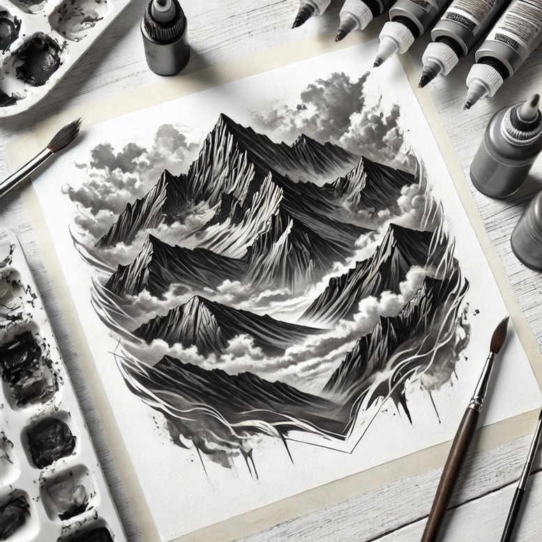 AI-generated tattoo project concept featuring a bold black and grey mountain range framed within a sketch-like composition. The design centers on a jagged silhouette of mountains rendered in deep black and mid-grey gradients, capturing alpine texture, snow highlights, and craggy ridges through layered shading. The piece rests on a sheet of paper surrounded by ink and brush, hinting at the traditional process behind the artwork. The technique blends realism with expressive line work, using crisp edges and smooth gradients to create depth and contrast suitable for skin. Its compact, landscape-oriented form makes it particularly apt as a cover-up piece for hiding scars or older ink, thanks to solid blacks that can mask underlying work while preserving a dramatic silhouette. The mountains symbolize endurance, a journey through challenges, and a sense of grounding, while the monochrome palette aligns with black and grey tattoo aesthetics. This concept merges black-and-grey realism with fine line detailing, enabling adaptation of scale and intricacy to fit small to mid-size placements. More broadly, the design speaks to meaningful tattoos that carry personal narratives: resilience, ascent, and the quiet power of nature as a constant companion. As an AI-generated tattoo project, it demonstrates a modern approach to design development, offering a clear blueprint that emphasizes negative space, contrast, and legibility on skin. Key visible elements are the mountain range, ink bottle, brush, and paper, with focus on stark blacks and subtle grey gradients. If executed on very dark skin or used as a cover-up, the heavy black areas and layered shading help obscure prior work while preserving a timeless landscape motif. Ultimately, this concept blends classic landscape symbolism with contemporary tattoo techniques, presenting a versatile option for meaningful tattoos, including small and medium-sized pieces, in both Japanese-inspired and modern Western black-and-grey traditions.