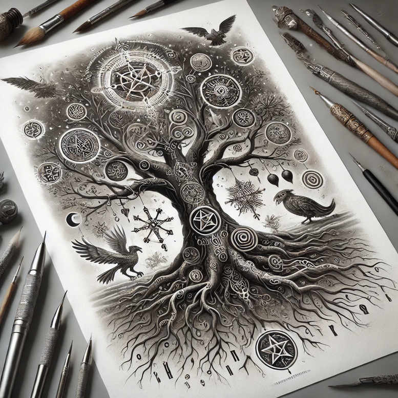 This tattoo design concept presents a tree of life rendered in black and grey ink with a network of roots grounding the composition, while an array of mechanical gears and concentric circles orbit the trunk and intertwine with crescent moons. Executed as a refined fine-line study with bold shadow and delicate detail, the design fuses organic growth with geometric motifs to create a piece that feels both natural and engineered. The tree’s branches reach upward, symbolizing resilience and renewal, while the roots anchor the image, echoing ancestry and personal grounding. The circular gear elements function as stylized planetary or mandala-inspired motifs, inviting contemplation of cycles, time, and interconnectedness, and the subtle grays maintain a timeless look. The moons add celestial rhythm, while the interspersed circles offer a pattern-like texture that can be used to enhance shading. The piece is ideally tailored for a bold black and grey tattoo on a suitable canvas, with strong contrast that ages well on diverse skin tones. For a small-to-medium canvas, the composition scales to chest, shoulder, or forearm placements, and the layered line work makes it adaptable as a standalone statement or as part of a larger body of work. This AI-generated tattoo project explores a dramatic cover-up-ready motif, with dense shading and morphable negative space that can obscure older ink while preserving a striking silhouette. In terms of discovery, the concept aligns with tattoo design themes such as meaningful tattoos, fine line tattoo, lotus flower tattoo, infinity tattoo, tribal tattoo, rose tattoo design, small tattoos, flower tattoos, custom tattoo design, Japanese style tattoo, black and grey realism, and body art. The symbolism of growth, cycles, and grounding invites personal reflection, while the graphical balance of nature and machinery communicates a narrative of harmony between the organic and the man-made. If a cover-up is desired, this design offers robust coverage potential owing to its dense blacks and pattern-like geometry, making it especially suitable for concealing prior tattoos or scars.