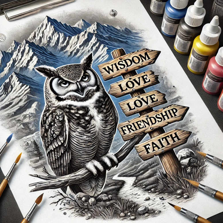 This is an AI-generated tattoo project concept featuring an owl perched on a branch with pinecones, wrapped by banners bearing Wisdom, Love, Love, Friendship, Faith. Rendered in black and grey with meticulous line work, the piece emphasizes realism and fine line detail. The owl’s feather texture, the wood-grain banners, and the naturalistic branch interplay create a cohesive composition suitable for shoulder or forearm placement. The banners carry a timeless sequence of virtues, inviting reflection on wisdom, affection, friendship, and faith as a personal creed. The negative space around the creature enhances contrast and readability, while the shading builds depth without sacrificing clarity for smaller tattoo sizes. The design leans toward a traditional-influenced realism with modern tonal control, ideal for a dedicated client seeking a meaningful tattoo design that remains legible when scaled down. It also serves as a versatile template for custom tattoo design work: you can adapt the owl’s gaze, adjust banner wording, or reposition elements to fit different body contours. The concept remains suitable for black and grey palettes and is compatible with fine line tattoo technique, mirroring the understated elegance of flower tattoos and tribal tattoo motifs through careful line weight variation. In sum, this AI-generated concept presents a refined, timeless piece with symbolic resonance, appropriate for those who value wisdom, faith, and connection; it is a tattoo design concept you can translate into lasting body art.
