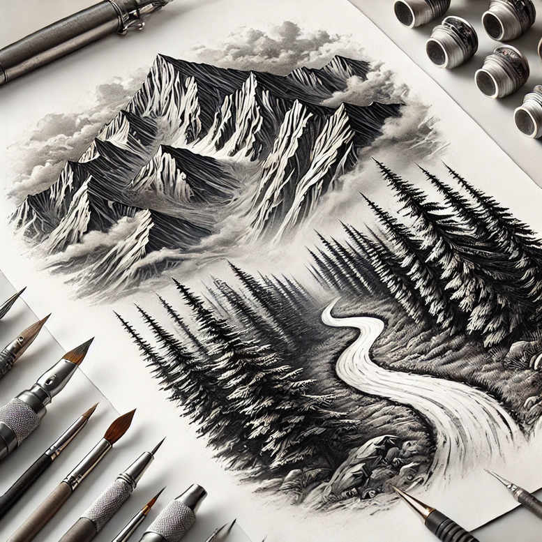 Rendered as a monochrome landscape, this concept functions as a versatile tattoo design blending natural motifs with a serpentine counterpoint. The central snake, executed in negative space and subtle grayscale shading, winds through jagged mountains and a stand of pines dusted with snow. The composition relies on black and grey ink, with carefully controlled contrast to preserve legibility on joints or torso while maintaining an atmospheric, realistic tattoo feel. The snake can symbolize transformation and resilience; the mountains imply endurance; the pines evoke renewal, while the snow provides bright highlights and a quiet negative space that enhances depth. Measured for both small tattoos and larger body art, the piece translates well to fine line tattoo techniques around the branches and along the serpentine curve, or to broader shading for a dramatic, high-contrast look suited to a back or calf canvas. The design can be developed into Japanese style tattoo influences or adapted into tribal or rose tattoo design motifs, depending on taste, and even into a lotus flower tattoo concept if a softer floral counterpoint is desired. It remains a strong candidate for meaningful tattoos with a personal symbolism, and its motifs pair well with ink-based themes such as infinity tattoo symbolism or nature-inspired narratives. From a production perspective, the image demonstrates how a detailed pencil drawing translates into a tattoo plan, with emphasis on line quality, gradation, and composition balance. As an AI-generated tattoo project, it offers a baseline for a custom tattoo design that honors nature’s austerity; given its dark values and bold silhouettes, it is particularly well-suited as a cover-up concept to renew a faded area without sacrificing impact, while still allowing for client-specific adaptations and placement flexibility.