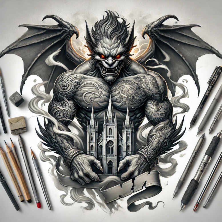 An AI-generated tattoo project rendered in black and grey realism, this design pairs a muscular demon with bat-like wings clutching a Gothic cathedral that rises from a curling scroll. The central cathedral anchors the composition with pointed arches and slender spires, while the demon’s carved musculature, amber eyes, and snarling expression create a powerful counterpoint. Fine line tattoo technique shapes the cathedral’s lacework and the creature’s tattooed textures, while smooth gradient shading builds volume across chest, torso, and upper arms. Ribbon-like wisps and smoke weave through the scene, framing the architecture and guiding the viewer’s gaze toward the cathedral’s façade. Studio tools—pencils, pens, markers, erasers—are scattered at the margins, echoing the idea of tattoo creation and the ongoing process of inking. The overall composition emphasizes negative space and bold silhouette, ensuring readability from a distance yet revealing intricate micro-details up close. Symbolically, the demon can represent strength, transformation, or the challenge to sacred space, and the cathedral signifies endurance, faith, and history. For those seeking meaningful tattoos, this piece fuses Gothic imagery with mythic power into a bold, multi-element tattoo design that lends itself to a large placement and remains adaptable as a cover-up when needed thanks to its deep blacks and dense shading. The design demonstrates how a custom tattoo design can blend Western architecture, dark fantasy, and modern realism, with nods to Japanese style tattoo shading techniques to achieve a cinematic effect. An AI-origin creation, this project showcases how digital concepts translate into enduring body art, offering a striking statement in black and grey that works well as body art, ink, and a durable tattoo design choice.
