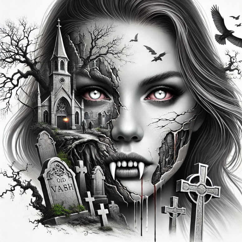 AI-generated tattoo project concept. The central motif is a woman’s face rendered in black and grey with high-contrast shading, its skin appearing as cracked porcelain that flows into a collapsing Gothic church and a desolate cemetery. The left side frames a spire and a ruinous nave while tombstones and crosses lean into the composition. Bare trees claw at the edges, their branches weaving into the brow and cheek. Fangs emerge from the lips, with a line of red suggesting blood, contrasting with the otherwise monochrome palette. Birds in flight hover above, adding movement and a sense of foreboding. The piece relies on graphic crack patterns and stark negative space to create a cohesive tattoo-ready design, suitable for wrap-around placements on the shoulder, forearm, or calf. The tension between beauty and decay mirrors themes of memory, mortality, and transformation. Technique blends fine line work for facial detail with bold, deep shadows for cemetery elements, using smooth gradations to achieve a lifelike yet stylized black-and-grey tattoo look. The silhouette is strong and highly contrasted, ensuring legibility at smaller sizes and translating well into a permanent linework and shading plan. Symbolically, the face fractures into architectural ruin, suggesting identity crumbling under time and history, while cemetery imagery anchors the narrative in a gothic tradition. This is an AI-generated tattoo project; the composition emphasizes cover-up potential due to heavy black areas and elaborate textures. Consider keywords such as tattoo, tattoo design, meaningful tattoos, fine line tattoo, black and grey, realistic tattoo, and ink for related pieces; additional exploration could incorporate lotus, infinity, tribal, or flower motifs in future iterations.
