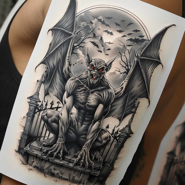 This AI-generated tattoo project features a dark, hyper-detailed demon gargoyle perched over a graveyard gate, with a full moon and a choir of bats patrolling the night. Rendered in black and grey, the anatomy is sculpted with bold chiaroscuro, taut musculature, and sinewy lines, while the wings spread wide with a leathery texture that catches subtle highlights. In the foreground, a wrought-iron fence and weathered tombstones frame the creature, creating a Gothic scene that reads as a vigilant guardian of sacred space and nocturnal power. The composition is deliberately dense in shadow, making it an excellent candidate for a cover-up: strong masses and deep gradients can conceal old ink or scars, while the prominent figure provides a striking focal point that remains legible across skin curvature. The design nods to Gothic horror and Japanese-inspired tattoo sensibilities through dramatic line work, dynamic pose, and careful proportion. A single accent—the demon’s red eyes—punctuates the grayscale palette without breaking the monochrome mood. The moonlit backdrop, the bats overhead, and the stone texture are achieved through layering and careful edge control to preserve readability when wrapped around a limb or torso. As an AI-generated tattoo project, it demonstrates how modern illustration can translate to wearable body art while honoring tattoo technique and healing considerations. This piece is easily scalable to larger canvases or reduced for small tattoos, and the core idea—a dark sentinel in a graveyard—offers customization, color toggling, and symbolic interpretation. In the broader world of tattoo design, the work blends meaningful tattoos with black and grey realism and could appeal to clients seeking a timeless, atmospheric statement piece.