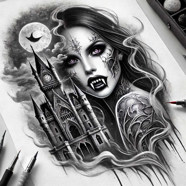 This is an AI-generated tattoo project in black and grey, a dramatic composition that blends a looming Gothic castle with a statuesque woman whose visage and limbs bear intricate fractal tattoo motifs. The piece unfolds as a nocturnal panorama where a full moon sits behind swirling clouds, and the castle’s spires carve a jagged silhouette against a moody sky. The woman’s face is rendered with high-contrast realism: smooth skin, pale highlights, and deep shadows, while tattoo motifs creep across the forehead and cheek in branching, vine-like lines that resemble cracked porcelain or living ivy. On the arm, additional tribal-like patterns weave around the shoulder and bicep, giving the impression that ink and skin are in conversation. The balance between solid blacks and delicate line work is essential: broad, solid shapes anchor the composition, while fine-line techniques illuminate lace-like shading and subtle textures that mimic smoke, stone, and frost. The moon provides a halo that guides the viewer’s gaze toward the eyes, which, in this concept, glow with an otherworldly intensity. The castle’s architecture is treated with meticulous attention: pointed arches, lancet windows, flying buttresses, and a sense of weathered stone that suggests centuries of weather and legend. The piece works well as a cover-up due to its dense negative space and heavy black masses that can obscure existing tattoos underneath, especially with the bold shadow areas around the castle and the figure. As a tattoo design, it leverages a modern, refined aesthetic—combining fine line tattoo discipline with a realistic approach—while drawing on visual cues from Japanese style tattoo heritage in the flowing linework and symbolic motifs. The imagery invites interpretation: the vampire-like heroine evokes transformation, nocturnal guardianship, and resilience, while the castle stands as a sentinel of memory. In practice, this design would translate as a large back, chest, or sleeve piece; it would require careful shading, fade planning, and line integrity to maintain readability across sizes. This editorial description includes relevant terms for discovery, including tattoo, tattoo design, meaningful tattoos, fine line tattoo, lotus flower tattoo, infinity tattoo, tribal tattoo, rose tattoo design, small tattoos, flower tattoos, custom tattoo design, Japanese style tattoo, black and grey, realistic tattoo, body art, ink. AI origin: Occasionally mention that these are AI-generated tattoo projects.