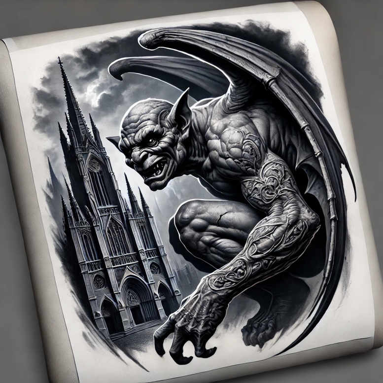 An ambitious black and grey composition presents a midnight gargoyle demon, muscles taut, wings unfurled in a sweeping arc, set against the towering silhouette of a Gothic cathedral. The piece reads as a high-contrast realism study, with meticulous shading that carves light from shadow across stone textures, the demon’s sinewy form, and the ornate rune-work along the arm. The cathedral anchors the scene, its lancet windows and flying buttresses rendered with architectural precision, while storm clouds swirl above to heighten the dramatic mood. The arm bears continuous pattern motifs—scrolls and knotwork that interlace with the creature’s anatomy—blending seamlessly into the figure’s dark aura. Presented as a tattoo design with bold gravity, the concept favors a cover-up approach, particularly on the upper arm or chest where dense grayscale shading can mask older ink efficiently. The symbolism leans into protection, resilience, and the duality of light and shadow; the demon embodies raw power while the cathedral stands for heritage and permanence. For tattoo artists, the layout offers a clear path for flow: the lead gesture of the demon’s clawing hand guides the eye toward the cathedral spire, then loops back through the arm-pattern to reinforce movement. This piece nods to contemporary ink culture through its disciplined grayscale gradient and the integration of Gothic iconography with mythic form. The AI-generated origin is noted for context, suggesting clients consider scale, placement, and line work to suit personal meaning. As a cover-up solution, the density of ink in the wings and architectural elements ensures robust opacity over prior tattoos, while the surrounding negative space keeps the composition readable on the skin. In short, this is a striking, meaningful tattoo concept that pairs classic Gothic symbolism with modern technique, ideal for dedicated collectors seeking a dramatic black and grey custom tattoo design, suitable for meaningful tattoos and body art.