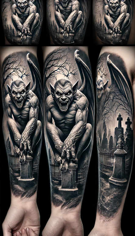An AI-generated tattoo project rendered in black and grey, this realistic composition depicts a muscular werewolf perched on a weathered tombstone within a desolate graveyard. The design extends along the forearm, featuring a bare, leafless tree behind the creature and a pale, high-contrast moon overhead, with iron fencing and distant gravestones adding depth. The piece uses bold shadows and fine gradients to define fur, stone textures, and night air, achieving a dramatic, cinematic effect. Although dark, the shading is balanced to facilitate a professional cover-up for existing tattoos, with dense black blocks that help mask previous ink and allow a seamless transition with skin tone. Symbolically, the werewolf embodies ferocity, resilience, and transformation, while the cemetery setting evokes memory and mortality; the moon emphasizes cycles and change. Technical notes: the artwork relies on black and grey realism, with careful layering to simulate fur, stone, sky, and atmosphere; this makes it suitable for a large placement such as a forearm sleeve or upper arm, or as a powerful standalone cover-up piece. This design aligns with tattoo storytelling, offering meaningful tattoos with a bold focal point around the creature’s snarling face and extended arm. If you are exploring other genres, this can be adapted to a Japanese style tattoo or a more traditional gothic vibe, and can be scaled to fit different body contours. AI-origin: this is an AI-generated tattoo project, reflecting modern design workflows that enable precise planning and sizing for a cover-up solution.