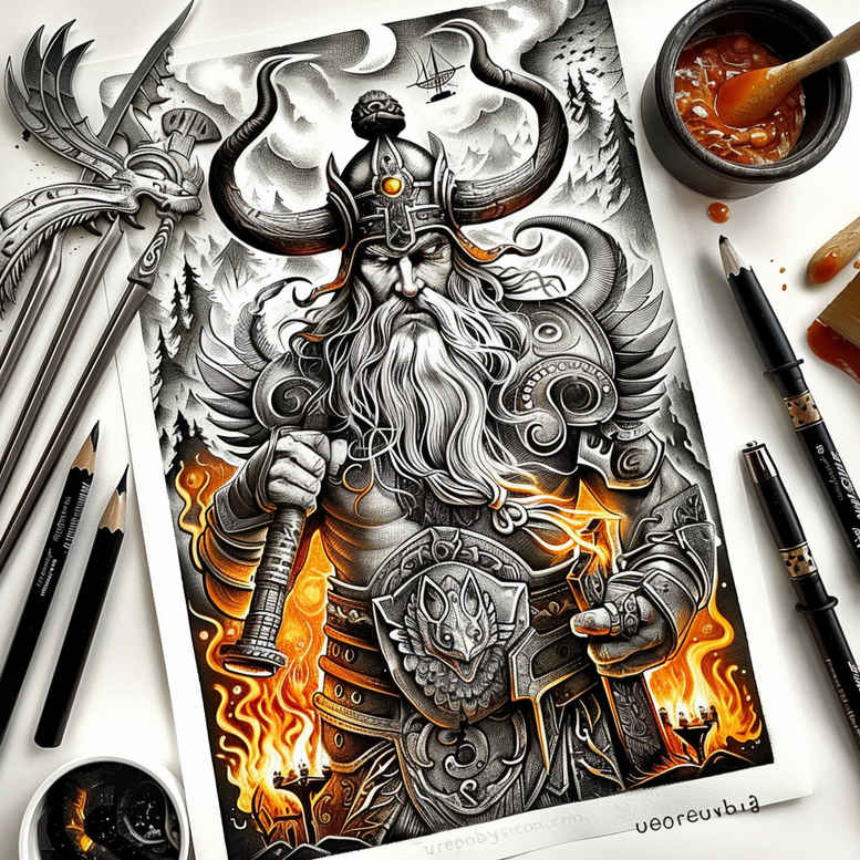 Perun, the Slavic god of thunder, rises as a monumental tattoo design in black and grey with selective orange flame accents. This concept presents a battle-ready warrior figure wearing a horned helm and intricate armor, a nod to ancient mythic motifs rooted in Slavic tradition. The central silhouette is framed by stylized bolts of energy and fiery embers that lick the ground, suggesting the god’s mastery of storm and lightning. The composition emphasizes strong vertical lines and dense negative space, allowing dramatic contrast between the hero’s iron-clad form and the smoky backdrop. The skillful use of fine line shading and smooth grayscale gradient creates a striking realism while preserving a timeless, mythic aura. Skull motifs along the edges evoke the underworld boundary and remind the wearer of mortality and protection, while reinforcing the warrior ethos common to sacred tattoos. The flames act as kinetic energy and a halo of power, guiding the eye toward the god’s stern expression and the weapon raised in his hand. The meaning of Perun tattoos centers on resilience, dominion over nature, and ancestral heritage; this design translates those themes into a wearable narrative: a guardian of order, a force that channels thunder into ink. It embodies meaningful tattoos that connect personal strength with a cultural pantheon, appealing to lovers of tribal tattoo, mythological symbolism, and bold black and grey aesthetics with fiery accents. Given the heavy black shading, the piece is also highly suitable for a cover-up, providing ample density to mask older ink beneath while the orange highlights keep the composition contemporary. As an AI-generated concept, it reflects current tattoo-art trends—high-detail line work, dynamic composition, and mythic iconography fused with grayscale shading. The line work is dense and polished, with careful cross-hatching to emulate stone and metal textures. Suitable placements include the upper back, chest, or thigh, where the composition can breathe and convey power, tradition, and a narrative-driven meaning.