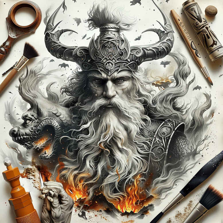 Rendered in a meticulous black and grey style with carefully placed orange flame accents, this tattoo design centers on Veles, the horned Slavic god associated with the underworld, magic, cattle, and thresholds between worlds. The figure is depicted in a ceremonial helm with prominent horns, a long, windswept beard, and layered armor featuring subtle runic motifs, all composed with dense linework and smooth gradations that create a powerful sense of volume. Flames swirl around the deity’s torso and palms, acting as both dynamic background and symbolic energy—fire as transformation, protection, and spiritual ignition. The overall composition emphasizes a vertical silhouette that would work well on the shoulder blade, upper arm, or back, with negative space carved to preserve breathing room for contrast and readability. Symbolically, the horned head signals primal force and mastery of nature; the underworld association speaks to wisdom guarded in darkness; the fire hints at rebirth through struggle, and the archaic garb anchors the design in ancient myth rather than modern fantasy. The tattoo design reads as a narrative piece: a guardian of thresholds, an emblem of power and mysticism. The artwork leverages bold blacks, delicate mid-tones, and restrained highlights to ensure longevity and readability on skin, while the orange embers provide focal points that draw attention to the deity’s gaze and the central aura of flame. For tattoo lovers seeking meaningful tattoos, this piece offers a rich story, excellent depth, and a timeless aesthetic. It’s described here as a project concept, but aimed at production-ready execution by a skilled tattoo artist who can adapt line density and shading to individual skin tones. If you want a darker, more ominous effect, the heavy black areas can be intensified to enhance cover-up potential, reinforcing why this design is ideal for concealing older tattoos while introducing mythic symbolism. AI-generated concept notes are included to provide a starting point; a professional studio should adjust details for ink longevity, placement, and client preferences, ensuring a unique custom tattoo design that remains faithful to Slavic myth while delivering contemporary visual impact.