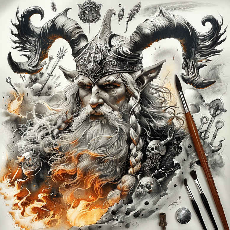 AI-generated concept for a Leshy-inspired tattoo design. The piece shows a horned forest spirit with a weathered face, long braided beard, curling horn, a slender staff, and flames that lick the lower edge while dark smoke swirls behind. Bold black lines and layered black-and-grey shading create depth, with selective orange flame accents for heat and focus. The Leshy, a guardian of the Slavic woods, embodies nature’s power, mystery, and protection. Horn evokes primal forest energy; braided hair and beads hint at tradition and lineage; fire represents transformation, life force, and courage; the staff signals authority over the wilderness. Runic-like marks and mist add arcana and magic, reinforcing its protective meaning. The composition uses negative space around the silhouette to keep the figure legible on different placements, while the flames and smoke add motion and contrast to a predominantly dark palette. Texture is suggested through subtle stippling and cross-hatching that emulate skin, fur, and fabric in a scalable tattoo design. This design is a strong tattoo design for a large placement on back, chest, or arm, and works well as a cover-up due to dense blacks that merge with skin tone. As a project idea and starting point for a custom tattoo design, it invites tweaks to line weights, negative space, and color balance to suit individual skin and style. For fans of meaningful tattoos, this Leshy concept blends folklore with contemporary ink aesthetics—graphic, dark, and expressive—without losing narrative clarity. This AI-generated concept demonstrates how Slavic myth can translate into modern body art, offering a cover-up friendly option that honors nature, transformation, and heritage.