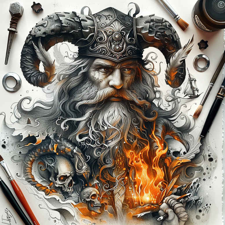 Perun-inspired Slavic mythological fire-skull tattoo design merges thunder-god iconography with a feral, skull-filled atmosphere. In this bold composition, a bearded deity wearing a horned crown dominates the center; the grayscale shading builds a sculptural, highly dimensional presence, while tongues of orange flame provide a vivid highlight that draws the eye to the core emblem of power. Surrounding the figure are stylized skulls that echo mortality and courage, reinforcing the mythic narrative of resilience in the face of fate, and the smoky tendrils that weave through the scene add depth and atmosphere. The piece employs strong line work and high contrast to achieve a dramatic, tattoo-ready result that translates well to large-scale body art or a back piece, with the dark, textured shading inviting close inspection. Symbolically, Perun, the Slavic god of thunder, is suggested by the horned crown and the dynamic energy of flame, representing protection, natural force, and renewal after storms. The skull motif invites reflection on life’s impermanence, transforming the design into meaningful tattoos that speak to heritage and personal strength. Stylistically, the image sits between dark fantasy and illustrative realism, using stippling and cross-hatching for texture while preserving a black and grey palette with selective orange highlights for focal points and longevity. As a project/idea, it offers versatility: the central figure can be enlarged, reduced, or adapted into sleeves or chest pieces, and it works well with ornamental metalwork on the crown and elemental fire around the silhouette. If the tattoo is intended as a cover-up, the dense black areas and bold shapes provide excellent coverage for existing ink, making it an ideal cover-up concept. This AI-generated design concept embraces contemporary myth-inspired realism while remaining faithful to Slavic myth’s symbolic language, creating a powerful narrative-ready piece for meaningful tattoos and custom tattoo design collectors.