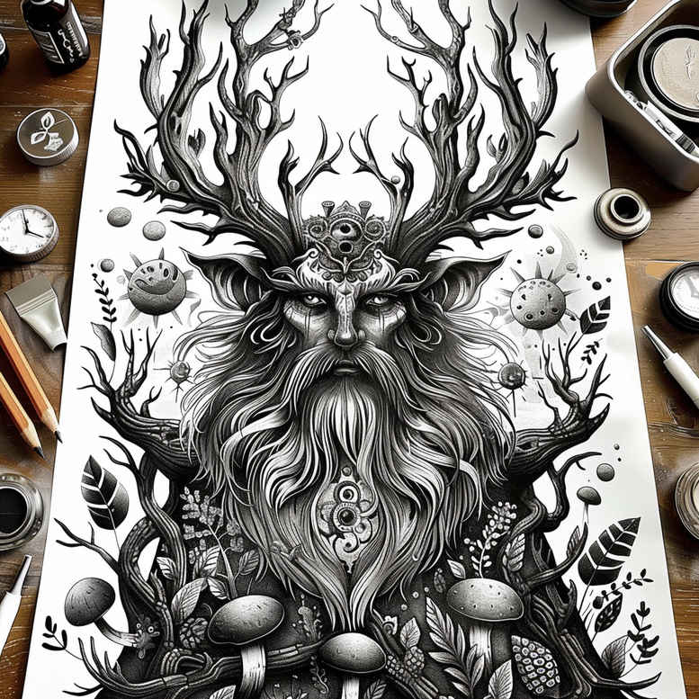 Leshy is the forest guardian of Slavic mythology, reimagined here as a powerful central figure whose form blends human and woodland symbolism. This tattoo design uses dense black and grey shading and precise line work to carve a bearded face beneath a crown of expansive antlers. The antlers rise like cathedral branches, framing the countenance and guiding the eye toward a cluster of mushrooms at the base, anchoring the composition in the forest floor and the cycles of growth, decay, and rebirth. Surrounding foliage and curling tendrils extend in balanced radii, creating a nearly mandala-like rhythm that communicates harmony with the natural world while preserving a strong focal point for the wearer. The contrast between deep blacks and soft grey washes creates texture and depth, allowing the image to read clearly on skin at various sizes. Symbolically, the Leshy embodies guardianship, transformation, and the liminal space between civilization and wild nature. The bearded visage conveys wisdom and ancient knowledge; the antlers symbolize strength, sovereignty, and the interconnectedness of all living things in the forest ecosystem. Mushrooms symbolize hidden knowledge, ecological cycles, and the mysteries of the undergrowth. The design’s symmetry and dense black negative spaces also give it a bold, enduring presence, making it suitable for larger canvases such as the back or chest, while still working well as a standalone piece on the arm. In terms of technique, the piece embraces a fine-line black and grey approach, with layered shading that mimics wood grain, bark textures, and fur, enabling crisp detail on high-resolution prints and durable skin ink. For the reader seeking meaningful tattoos, this Leshy-inspired motif offers a narrative of nature, myth, and protection; it also aligns with trends in tribal tattoo motifs and Japanese-styled timbered iconography through its stylized silhouette and disciplined line economy. The description acknowledges that this is an AI-generated concept, a starting point for a custom tattoo design that a skilled artist can tailor to individual anatomy and skin tone. As a cover-up candidate, the composition’s heavy black areas and dense silhouette are particularly forgiving, able to mask underlying tattoos while preserving the integrity of the mythic imagery and its symbolic meaning: nature’s guardian, a watcher of forests, and a totem of resilience.
