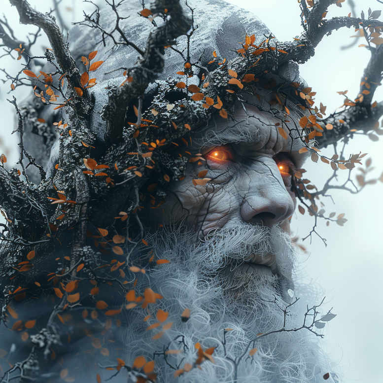 An arresting examination of Slavic myth centered on the Leshy, the forest spirit, rendered as a looming male figure whose face emerges from bark and mist while branches wrap like living armor. The design is executed in black and grey with a restrained accent of burnt-orange leaves, emphasizing the organic texture of wood, skin and sinew. The composition places the weathered face at the core, the eyes carved with depth and a calm, watchful expression, while branches thread through the hair and shoulders, suggesting a living tree that both shelters and wards off intruders. The repeated motif of branch and leaf creates a pattern-like rhythm across the skin, giving a sense of movement even in a still portrait. The Leshy’s symbolism is rich: protector and trickster of the woods, guardian of animals, keeper of paths and moods of the forest, representing the intertwining of nature and the human psyche. The contrast between the pale gray skin and the dark void around the eyes highlights the figure’s ancient wisdom and otherworldly presence, while the orange leaves provide a seasonal anchor—autumnal change, transition, and the cycle of life and decay. As a tattoo design, it blends realism with stylized natural elements, leaning toward black and grey realism with fine line texturing and subtle negative space, achieving a balance between detail and readability on the skin. The concept reads as a timeless homage to myth, inviting contemplation of humanity’s relationship with the wild and the unseen. For wearers, this design signals resilience and reverence for nature, making it a meaningful tattoo choice for those drawn to meaningful tattoos, forest lore and Slavic folklore. This description is an AI-generated concept, conceived for a large, statement piece; the heavy shading and bark textures lend themselves to a dramatic, high-contrast result that naturally suits a cover-up if placed over existing ink, with the repeating branch and bark patterns offering texture that can be echoed in surrounding areas for cohesion. In short, the Leshy tattoo design embodies transformation, guardianship, and the deep well of myth that feeds body art, ink, and personal storytelling.