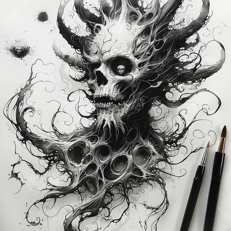 This Koschei the Deathless-inspired tattoo design renders a foreboding, skeletal visage crowned with horns, emerging from an intricate veil of smoke and curling tendrils. Executed in black and grey, the piece relies on bold negative space and layered shading to create a three-dimensional skull that feels both ancient and ageless, while the horned crown adds mythic authority and ancestral weight. The surrounding wisps function as a repeating motif, weaving through the composition like a forest at night and giving the design a pattern-like rhythm that can be extended around a limb or torso. Symbolically, Koschei the Deathless embodies the paradox of immortality tied to hidden parts and guarded knowledge, a notion this tattoo translates into a meditation on mortality, secrecy, and resilience. The blackwork aesthetic emphasizes stark contrasts between the bone-white highlights and the deep blacks, reinforcing themes of life versus death and the unseen forces that govern fate. The piece also evokes Slavic forest spirits and shadowy demonic energies, aligning with the broader pantheon of mythic guardians such as Veles and Perun, thereby creating a dynamic dialogue between light and dark forces within the wearer’s narrative. For a collector seeking a meaningful tattoo that doubles as a bold statement, the design’s dense black areas and layered shading make it exceptionally suited for cover-up applications, while the repeating swirl patterns offer a versatile pathway for future expansion. If this concept is AI-generated, it demonstrates how algorithmic drafting can fuse mythic symbolism with contemporary ink aesthetics to yield a provocative, enduring body art piece. Overall, this tattoo design blends myth, mortality, and monolithic silhouette into a cohesive image that resonates with admirers of black and grey realism, meaningfully-tated tattoos, and impactful skull imagery.