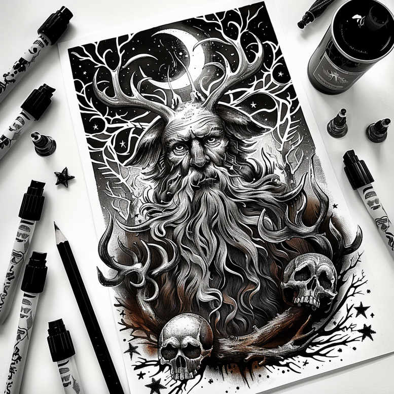 This Leshy-inspired forest guardian tattoo design channels the enigmatic Slavic forest spirit through a dense composition that sits between myth and ink artistry. Rendered in black and grey, the central figure is a horned, bearded elder whose antlers resemble gnarled trees, weaving into a canopy of curling branches and subtle floral motifs that frame the face. The shading is meticulous, employing smooth gradients and stippling to sculpt volume in the cheeks and brow while preserving a moody, night-sky atmosphere. Skulls cluster at the base of the design, anchoring the lower portion and symbolizing mortality, vigilance, and the forest’s cautionary memory. Subtle stars punctuate the edges as celestial accents, balancing the weight of the skulls and inviting the viewer’s eye upward toward the horned crown. The overall silhouette remains legible at varying sizes, making it suitable for large back pieces as well as shoulder or chest placements. In Slavic folklore, the Leshy is a guardian of woods, paths, and beasts; the antlers echo the forest crown, while the weathered face and beard evoke ancient wisdom and endurance. The skull imagery nods to the cyclical nature of life and death within nature’s cycles, a theme reinforced by the interwoven branches that create repeating geometric-like patterns across the design. The tattoo design invites personal interpretation, suggesting a journey into nature, transformation, and the wearer’s bond with myth and memory. The artwork embraces a modern tattoo aesthetic—bold line work, crisp black ink, soft gradient shading, and controlled negative space—while remaining rooted in traditional black and grey tattoo principles. This AI-generated concept offers a contemporary rendition of an age-old archetype, ideal for meaningful tattoos that celebrate folklore, forest lore, and the wearer’s path through time.