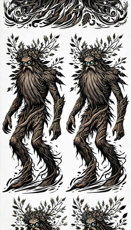 Interpreting the Leshy as tattoo subject, this design presents two mirrored forest guardians carved in dense black and grey shading. The composition centers on hulking, shaggy figures whose fur texture is built from a lattice of fine lines that mimic bark, moss, and bristles. Branch-like extensions crown their heads and sweep from their shoulders, weaving into an organic frame that suggests a living tree whose limbs guard and misdirect. The repeat motif of two figures creates a rhythm reminiscent of traditional Slavic woodland lore, while generous negative space around them enhances contrast and depth. The aesthetic leans toward a realistic black and grey style rather than color, with emphasis on texture: fur rendered with cross-hatching and stippling, bark-like skin patterns, and smoky shadows that imply movement and form. Symbolically, the Leshy embodies the forest’s guardian and trickster—an embodiment of nature’s duality: protection and peril. Tattoos featuring this figure often convey resilience, roots, and a deep bond with the wild, as well as humility before the ancient woods. The doubling of figures can symbolize dual aspects of the same spirit or a dialogue between observer and guardian, making it a powerful choice for larger placements such as back pieces or full sleeves. This concept embraces the tradition of meaningful tattoos by turning myth into a personal totem, while maintaining a timeless monochrome spectrum that ages gracefully on skin. In practical terms, the black and grey palette and dense shading render well on diverse skin tones, ensuring strong silhouette and longevity of ink. AI-generated concept notes: the piece blends folkloric symbolism with contemporary line work to offer a striking, culturally resonant motif; it is particularly suited for a cover-up due to heavy black areas and the complexity of texture within the fur and branches.