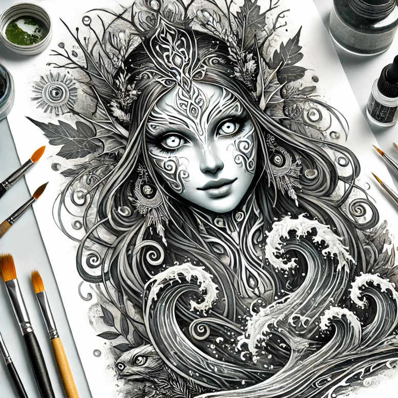 Cover-up-ready, black-and-grey, fine-line tattoo design inspired by Slavic myth, featuring a serene female figure framed by a crown of leaves and stylized vines. Two serpents coil around the composition, their bodies weaving through hair and floral scrolls, representing transformation, renewal, and the protective power of ancient deities. The overall layout blends ornamental line work with organic motifs, creating a balanced symmetry that reads as both portrait and emblem. The style relies on fine-line technique, with subtle dot-work shading to create depth without losing the crisp clarity of the black ink. The symbolism anchors the design in Slavic tradition: the figure is reminiscent of Lada, goddess of beauty and fertility, embodying seasonal renewal and feminine wisdom; the flora connotes growth, abundance, and earth’s generosity, while the serpents evoke dual forces—danger and healing, life and death—within a never-ending cycle. The recurring pattern elements—leaf shapes, curling tendrils, and scales along the serpents—produce a hypnotic rhythm, a hallmark of this concept that makes it suitable as a standalone piece or a component of larger work. Because the image is heavily shaded with dense blacks, it reads strongly on the skin and hides underlying tattoos or blemishes, making it an excellent cover-up option for older work or darker skin tones. This concept is AI-generated as an initial exploration for a custom tattoo design; it is presented here as a polished blueprint for a professional tattoo artist to adapt to client preferences, including placement on the back, chest, or arm. The interplay of gaze, serpentine motion, and botanical ornament invites close scrutiny, rewarding repeated viewing as new details emerge—an attribute many collectors seek in meaningful tattoos and custom tattoo design. Ultimately, this is a modern interpretation of a Slavic myth figure, merging ancient symbolism with contemporary line work to produce a timeless tattoo that honors nature, fertility, and feminine power. The design’s cover-up potential ensures it can be placed over faded or unwanted ink while preserving the figure’s clarity and the integrity of the ornamental composition, making it a practical choice for clients seeking both story and impact.