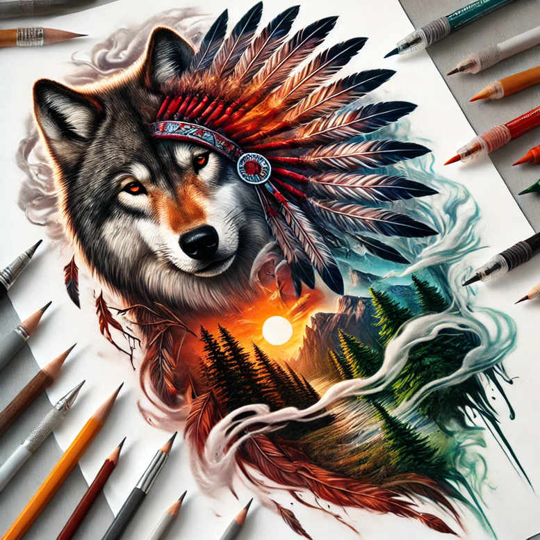 This image presents a bold, full-color tattoo concept centered on a wolf head wearing a native-inspired feather headdress. The composition blends wildlife portraiture with landscape vertigo: a radiant sun sits low over jagged mountain silhouettes, pine trees crowd along a ridge, and wispy smoke curls around the lower curves of the design. The palette moves from warm amber and burnt orange in the sky to cool teal and emerald greens in the trees, while the wolf’s fur shifts through blacks, grays, and warm browns to create a lifelike yet stylized presence. The feathers in the headdress radiate outward in a symphony of blues, reds, and ochres, providing a dramatic halo that anchors the gaze and lends a ceremonial, almost tribal energy to the scene. Executed as a high-contrast, full-color tattoo concept, the piece leans toward realism in shading and texture, yet the arrangement insists on a graphic, pattern-like rhythm that could read vividly on skin from a distance or up close. This is an AI-generated tattoo project concept, designed to test resolve, line weight, and color harmony across scales. The wolf symbolizes loyalty, guardianship, and intuition, while the sun evokes renewal and a sense of journey; the mountains and pines nod to wilderness and endurance. The cloud-like smoke adds movement and connects the natural elements into a cohesive narrative about courage, identity, and the call of the wild. For tattoo design enthusiasts, this concept demonstrates how a single subject—the wolf—can anchor a sprawling landscape within a single panel, making it suitable for larger placements or as a striking sleeve motif. In terms of technique, the piece reads as a combination of fine line detailing for the facial features and bold, saturated fills for the feathers and landscape, which aligns with trends in modern Japanese style tattoo and realistic tattoo traditions. The overall effect is a dynamic, meaningful tattoo design that blends animal portraiture, nature scenery, and ceremonial symbolism into a single, memorable body art statement; it also serves as a versatile base for further customization in a custom tattoo design workflow, incorporating elements such as a lotus flower tattoo or infinity tattoo motifs if desired.