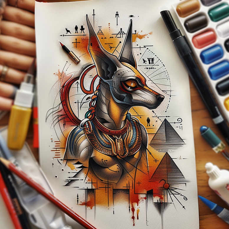 Anubis from Egyptian mythology anchors this tattoo gallery entry as a powerful study in mythic guardianship and sacred geometry. The central figure is Anubis, the jackal-headed god associated with mummification and the afterlife, rendered here with a ceremonial nemes-style headdress and stylized armor plates that evoke ancient iconography while remaining unmistakably contemporary. The composition leans on clean, fine-line ink to outline the deity’s profile, while bold geometric triangles in the background hint at pyramids and stepped forms, creating a rhythm that guides the eye across the canvas. Watercolor washes in warm orange-gold and cool blue tones contrast with the stark black linework, producing a painterly effect that feels both dynamic and controlled. The color choices symbolize divinity, energy, and the Nile’s flow—orange suggesting solar power and life, blue recalling night skies and sacred waters—while the interplay of light and shadow gives depth and movement within a two-dimensional surface. Symbolically, this tattoo design fuses ancient symbolism with modern tattoo techniques: the jackal guardian represents protection and guidance for the soul, the headdress signals royal authority, and the geometric triangles imply order, balance, and sacred geometry—an enduring reminder of life, death, and transformation. The piece sits at the intersection of traditional Egyptian iconography and contemporary fine-line artistry, making it a meaningful tattoo for those seeking a powerful mythic narrative and a standout form of body art. As a concept, it is AI-generated, offering a fresh, algorithmic perspective on how mythic imagery can be rendered with precise linework and painterly color. This entry, part of a tattoo gallery inspired by Anubis from Egyptian mythology, celebrates timeless symbols through a modern lens with careful attention to composition, symbolism, and the craft of ink, inviting reflection on guardianship, eternity, and the journey of the self.