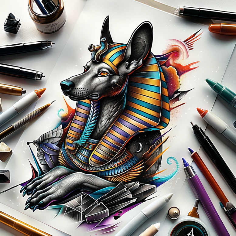 Anubis-inspired tattoo design channels the ancient Egyptian deity of mummification and the afterlife, presenting a wolfish jackal head crowned with a striped nemes headdress. The work uses a vibrant color palette—electric blues, golds, and garnet accents—set against bold black outlines that give the piece a strong, contemporary tattoo look. The jackal’s gaze is calm and watchful, symbolizing protection, guidance, and the journey between worlds. In Egyptian symbolism, Anubis governs mummification and weighing the heart against a feather, a ritual of balance and moral truth; this concept translates that solemnity into wearable art, a reminder of transformation and spiritual guardianship rather than purely decorative imagery. The composition centers on the head, allowing for a scalable tattoo that can work on the upper arm, chest, or back; surrounding negative space and selective shading enhance depth while preserving a crisp silhouette for longevity. The headpiece’s alternating color bands create a pattern of rhythm and movement, a visual echo of ancient hieroglyphic order and modern graphic storytelling. The fur and contours are articulated with a mix of solid lines and subtle gradient washes, producing a semi-realistic to illustrative style that appeals to both fine line tattoo enthusiasts and artists seeking bold color tattoos. The design nods to mythic authenticity while embracing current tattoo trends, offering dramatic impact from a distance and rich texture on close inspection. Whether inked as a standalone piece or incorporated into a larger sleeve, this Anubis-inspired concept communicates meaning—guardianship, passage, and balance—through form, color, and symbol. AI-generated concept notes add a contemporary edge to the ancient symbolism, inviting personalized adaptation for individual placements and skin tones. In sum, this tattoo design invites collectors of meaningful tattoos to explore a fusion of myth, color, and modern linework, creating a powerful body art statement.