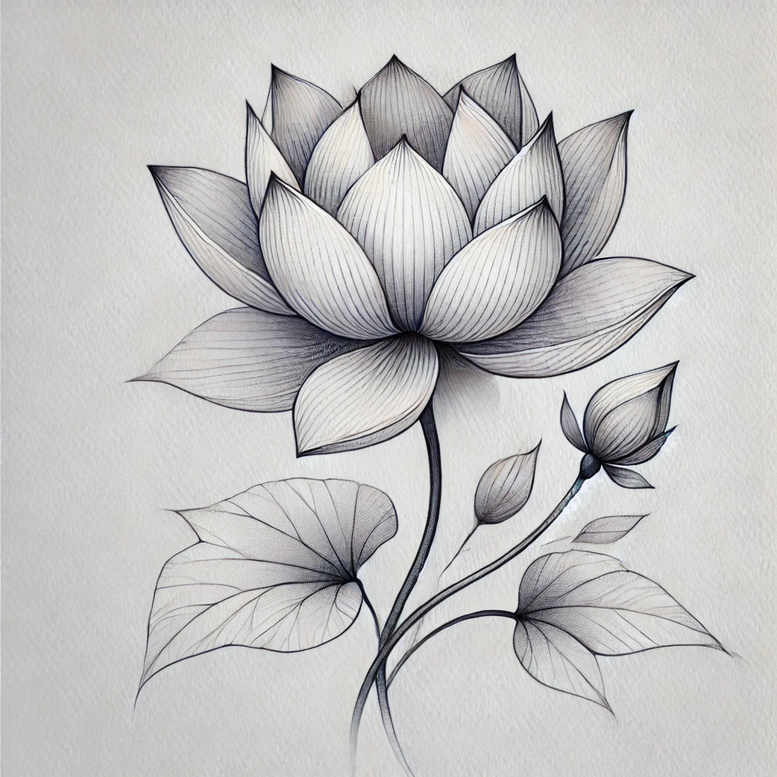 This AI-generated tattoo project showcases a lotus in full bloom rendered in precise black-and-grey linework. The composition centers on a symmetrical lotus head, with layered petals radiating outward, a slender stem, and accompanying buds and leaves. Each petal is defined with subtle cross-hatching and vein-like lines, creating a graphic, pattern-driven motif that invites close inspection. The design balances bold linear structure with delicate shading, achieving a refined look suitable for fine-line tattoo work in black ink or as a cover-up-ready base when scaled. The lotus symbolizes purity, rebirth, and spiritual growth, while the surrounding stems and leaves introduce movement that guides the eye toward the blossom. The line quality is crisp with steady tapering, enabling clean execution by a tattoo artist and preserving detail over time. This concept functions as a stand-alone tattoo design or a starting point for a custom design session; it lends itself to placement on the forearm, upper arm, calf, or back due to its flowing silhouette. While rooted in a Japanese-inspired botanical aesthetic, the piece remains versatile across styles, from black-and-grey realism to graphic line art. For clients seeking a meaningful tattoo, the lotus motif paired with vein-like pattern work offers a timeless option suitable for small to medium sizes. If desired, the concept can be adjusted to incorporate subtle gradients, solid silhouettes, or additional lotus buds for greater impact. This is an AI-generated tattoo project concept meant to inspire a licensed artist’s interpretation and a bespoke tattoo design, with emphasis on pattern, technique, and personal meaning.