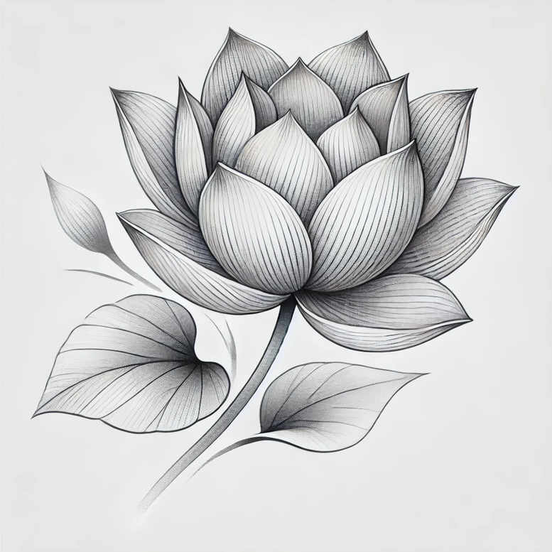 Presented as an AI-generated tattoo project, this design showcases a lotus blossom rendered in precise fine-line technique. The central bloom is built from stacked petals with subtle cross-hatching and grayscale shading that creates a gentle gradient and a sense of depth, while a slender stem curves beneath and supports two drooping leaves. The line work remains consistent in weight, allowing the piece to read clearly as a stand-alone motif or to be incorporated into a larger body-art composition. The botanical form is restrained yet intricate: each petal edge is defined by delicate parallel lines, the texture suggesting a natural, almost illustrated quality. Symbolically, the lotus stands for purity, growth, and spiritual awakening, making this a meaningful tattoo design for wearers seeking a quiet yet expressive symbol. The black-and-grey palette ensures broad compatibility across skin tones and ages gracefully with time, particularly in small tattoos or as a focal centerpiece on the forearm, wrist, or behind the ear. From a technical perspective, the design emphasizes negative space around the blossom to preserve clarity, with careful tapering at tips to prevent blurring over years of wear. The AI origin note reflects a digital conception that studios can adapt or refine, perhaps adding subtle shading or texture or converting parts into dotwork if desired. In broader tattoo-design discourse, this lotus motif pairs well with themes from Japanese-style traditions or floral motifs, offering a versatile base for custom tattoo design. Overall, the image embodies contemporary fine-line aesthetics, black and grey ink, and meaningful botanical imagery that resonates with both casual and devoted tattoo enthusiasts, making it a robust reference for ink artists pursuing elegant, precise body art.