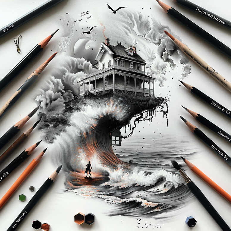 This dramatic tattoo design concept merges architectural precision with elemental force to tell a narrative about home, memory, and resilience. A two-story house sits precariously on a rocky promontory that seems to emerge from a colossal black-and-grey wave, its jutted porch and gabled roof rendered with fine line accuracy and subtle cross-hatching to convey timber textures and weathered surfaces. The enormous curl foams below, with bold sweeping strokes that suggest movement and velocity, while the orange accents along the wave create focal energy and depth without overwhelming the monochrome palette. Above, a sky of turbulent clouds stretches across the scene, punctuated by a scattering of birds in flight, which balance the weight of the composition and guide the eye toward the house as the center of gravity. A lone figure stands on a small board where the wave bends, introducing scale and a human story—perhaps a pilgrim or traveler facing the pull of the unknown. The piece leans toward a graphic, almost tattoo-parlor mural mood, yet remains highly translatable to real skin through clean outlines and controlled shading. As a cover-up option, the design’s heavy dark mass and silhouette-driven forms offer excellent camouflage for older tattoos, and its dense negative space around the edges ensures readability on larger areas like the back or thigh. The concept is suitable for a range of tattoo styles—from fine line tattoo details and black and grey realism to more Japanese-inspired linework or traditional bold outlines—while preserving the core motif: a home standing against the sea’s power. Produced as an AI-generated tattoo project, it serves as a robust starting point for a bespoke tattoo design, allowing artists and clients to tailor line weight, scale, and symbolism to personal meaning. In practice, the design supports further motifs such as lotus flower tattoo accents, infinity tattoo themes, or small flower tattoos, enabling a cohesive sleeve or chest piece that remains legible, meaningful, and visually striking in ink.