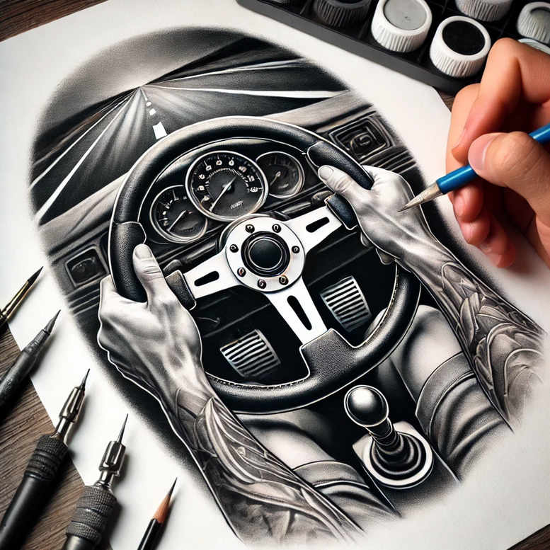 This AI-generated tattoo project concept presents a hyper-detailed, black and grey study of a steering wheel held steady by gloved hands, shown in a grayscale drawing that mimics a real tattoo design meeting the viewer’s eye. The composition centers on the steering wheel, with the tattooed forearms revealed by crisp linework and gradual shading that mimics skin texture. The gloves and the dashboard instruments are rendered with careful contrast to emphasize light and shadow, while the sleeves display geometric motifs that hint at a pattern-driven approach to body art. Surrounding the scene, drafting tools—pens, pencils, nibs—frame the moment of creation, reinforcing the link between drawing and tattoo practice. The overall mood conveys control, momentum, and craftsmanship—concepts familiar to lovers of meaningful tattoos and fine line tattoo styles. The piece is intentionally adaptable: its black and grey palette supports both realistic tattoo aesthetics and more graphic, high-contrast interpretations. As a tattoo design, it lends itself to a range of applications from small tattoos that capture the steering wheel motif to large sleeves featuring repeating patterns and complementary elements such as lotus flower tattoo or rose tattoo design accents. The concept also nods to broader styles—Japanese style tattoo sensibilities in rhythm of linework or tribal tattoo textures—while remaining accessible as a custom tattoo design that translates well to skin. For tattoo enthusiasts and studios, this is a versatile, ink-ready concept that demonstrates how line precision, shading, and symbol-rich imagery can coexist in a single, striking body art piece. While presented as a study, the AI-led approach generates a robust starting point for commissions, highlighting the potential of AI-generated tattoo projects to expand creative possibilities without sacrificing realism, detail, or legibility across different skin tones.