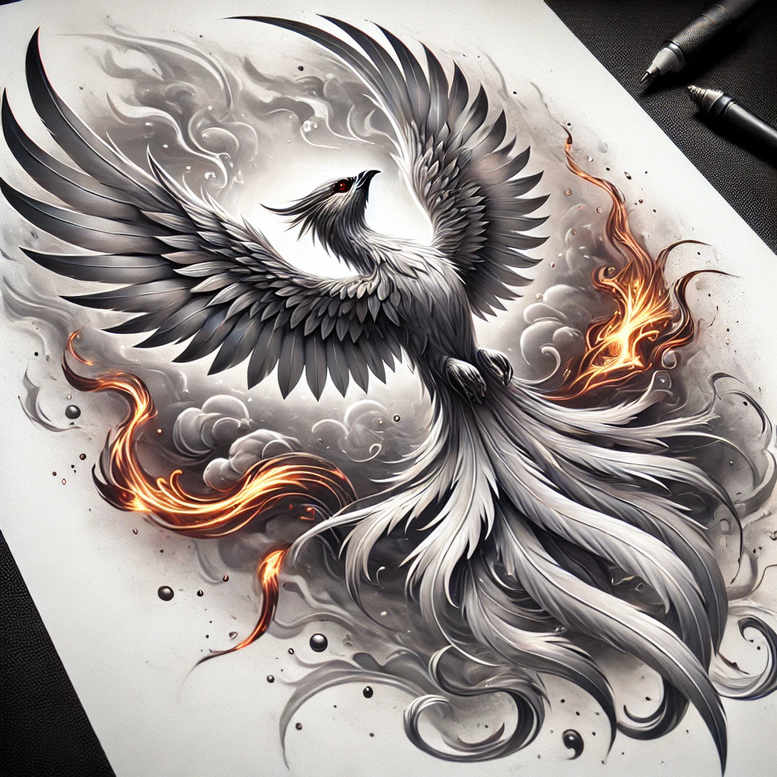 This AI-generated tattoo project presents a meticulously rendered phoenix in a black-and-grey palette, with vivid orange flames and curling smoke adding heat and contrast. The bird’s wings dominate the composition, each feather drawn in fine lines with subtle graduation from near-black to mid-gray, while the tail swirls in a ribbon of lighter shading that enhances movement and grace. The design relies on careful layering, negative space, and controlled shading to preserve clarity on skin while inviting up-close inspection of texture and detail. Symbolically, the phoenix embodies renewal, courage, and transformation, making this piece an especially meaningful choice for someone marking a fresh start or personal milestone. The piece aligns with a modern, realistic tattoo aesthetic while nodding to Japanese-style lineage through sweeping arcs and balanced composition, ensuring it remains versatile for placement on the shoulder, arm, back, or chest. The orange flame accents spark focus points without overpowering the grayscale backbone, allowing the tattoo to age gracefully and maintain readability as it heals. For a wearer seeking a bold statement, the concept scales well to a full-back or large sleeve; for a subtler option, it can be trimmed to a prominent head-and-wing study. The imagery also invites personalization—additional blossoms, infinity motifs, or subtle tribal accents can be layered as secondary elements in a sleeve or chest panel. From a meaning perspective, the phoenix embodies renewal, courage, and transformation, themes commonly chosen for meaningful tattoos and personal symbolism. While presented here as a finished concept, the piece translates well into ink with crisp line work and soft shading that ages gracefully in black and grey. The project demonstrates how AI-generated design can inform tattoo artists and clients toward a timeless, durable body art piece, suitable for both technical precision and expressive imagination. It also highlights placement planning, scale, and flow with the contours of the body, ensuring the final result reads coherently from multiple angles. This design is ideal for those seeking a bold yet refined statement piece, balancing dramatic flame accents with restrained grayscale shading. In sum, it showcases a modern approach to tattoo design, where digital artistry meets traditional craft to produce meaningful tattoos and memorable body art.