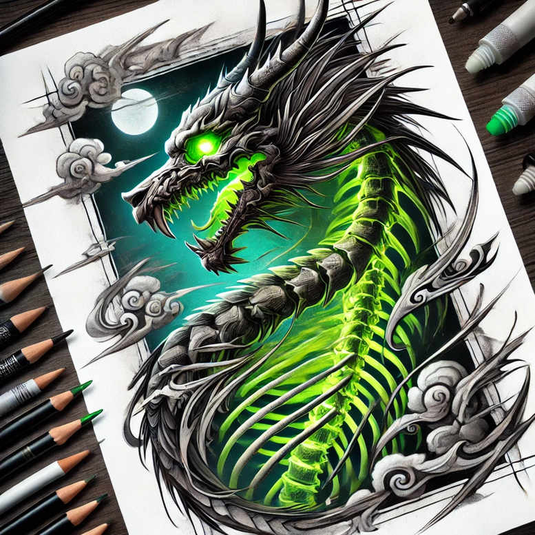 AI-generated tattoo project presented as a high-contrast fantasy dragon design, executed as a dynamic fusion of black and grey linework and luminous neon-green energy. The central motif is a serpentine dragon, its spine formed by interlocking vertebrae that glow with an electric neon-green aura. The head is fierce, with jagged teeth and a piercing green eye that seems to pierce the page. Surrounding the beast, wisps of cloud and a pale moon sweep across negative space, creating a cinematic frame that suggests motion and breath. The composition sits on a sheet of sketch paper, with visible pencils and quick strokes along the margins, reinforcing its origin as a design study and a potential tattoo project. The piece plays with pattern and texture: intricate scales, barbed spines, and ornamental swirls that nod to Japanese and tribal tattoo motifs, while staying contemporary. The result is a bold, graphic design suitable for a large back or sleeve, but adaptable as a smaller piece depending on placement. The neon-green glow is not merely decorative; it conveys vitality and life force, while the black and grey shading provides depth, contrast, and legibility on skin over time. The work also functions as a capable cover-up; the dense dark elements can obscure older marks, with the bright neon accents drawing attention to the new design. This is an AI-generated tattoo project, offering a modern voice in body art that can be refined into a refined tattoo design, including possibilities for a fine line tattoo, black and grey realism, or full-color ink. In sum, this concept blends fantasy and symbolism to create a meaningful tattoo that remains legible, scalable, and visually striking across sizes, and it stands as a strong candidate for a custom tattoo design that embraces both graphic pattern and dynamic motion.