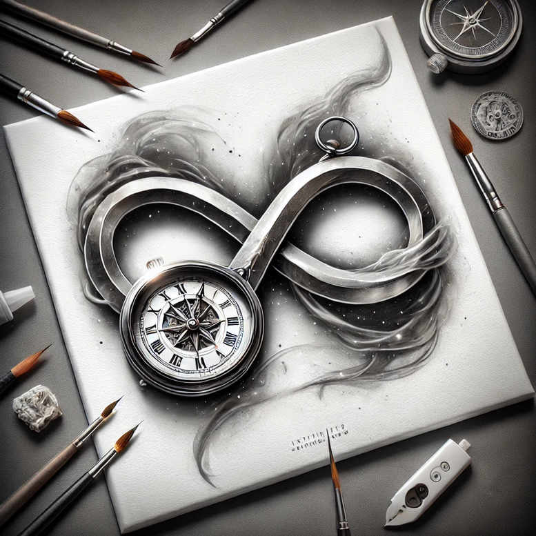 An intricately rendered grayscale study centered on a pocket watch fused with an infinity motif and a compass rose, a modern tattoo design exploring time, direction, and endless possibility. The composition uses soft gradients, stippling, and precise linework to mimic metal, glass, and shadow; the watch face shows Roman numerals with a subtle chrome glare, while the infinity loop forms a flowing double ribbon that suggests motion and continuity. Surrounding elements—a brush, a pencil, a small crystal, and a sheet of paper—evoke a traditional studio workflow and position the concept as a blueprint for skin. The grayscale palette emphasizes bold contrast and subtle texture, enabling a tattoo artist to translate fine line details, smooth shading, and realistic black-and-grey ink on skin. Symbolically, time and direction meet infinity, a theme that fits meaningful tattoos and aligns with infinity tattoo, rose tattoo design, lotus flower tattoo, and other symbolic motifs. The piece nods to Japanese style tattoo through clean line work and controlled negative space, while remaining adaptable to tribal or realistic interpretations in custom tattoo design. Though presented as an AI-generated tattoo project concept, it is intended as a practical design for ink, capable of scaling from small tattoos to large back pieces; in a darker interpretation, the monochrome contrast makes it especially suitable for a cover-up, allowing old ink to merge into the loops and compass centerpiece. This concept embraces body art, ink, and the broad spectrum of tattoo design language, offering a strong base for a striking, timeless tattoo.