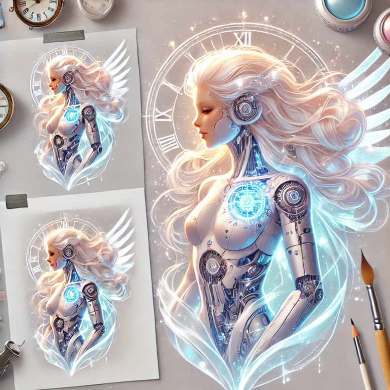 These AI-generated tattoo projects present a striking concept: a cyborg woman with winged chrome plating and luminescent blue energy, set against a wheel of time. The central figure shows a lit chest core and circuitwork across the torso and limbs, rendered with luminous highlights and painterly shading that mimics skin beneath metallic armor. The wings extend behind the figure, formed of stylized feathers interlaced with circuitry and glow. In the background, a large clock face with roman numerals recedes, reinforcing themes of time, memory, and fate. The composition uses a cool palette dominated by blues and whites, with neon accents that convey motion and vitality. The artwork is photographed on canvases visible in the studio, with brushes and clamps nearby to suggest the tattoo design process. The piece embodies a fusion of humanity and machine, the wings symbolizing freedom and ascent in a tech-driven world. As an AI-generated tattoo project, it demonstrates how digital art can yield highly detailed line work and dynamic shading that translate well into a large-scale tattoo, including fine line elements around circuitry and facial features. The motifs—cyborg anatomy, clock motif, wings, and glow—invite interpretations of transformation and resilience, and can be tailored to personal meaning, such as milestones or meaningful tattoos. While not depicting lotus flower tattoo or infinity tattoo motifs, it can be adapted to lotus, infinity, tribal, or rose tattoo design cues; it could be rendered in black and grey or full color. For someone seeking a futuristic tattoo design, this concept offers a bold silhouette with clear focal points and adaptable scale for back, chest, or sleeve placements. The contrast between cold metal and warm skin tones can be refined by the tattooist, and the neon circuitry can be emphasized or muted depending on skin tone and ink strategy. The image serves as a powerful starting point for a custom tattoo design, with potential variants ranging from hyper-realistic to stylized graphic, and it aligns with current trends in body art that favor color pops in black and grey foundations. In sum, this AI-generated tattoo project captures a science-fiction myth of strength and renewal, a meaningful tattoo concept that bridges digital and real-world ink.