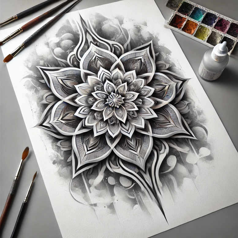An AI-generated tattoo project presenting a meticulously rendered mandala lotus in black and grey, designed in a fine-line tattoo style. The central lotus unfolds in concentric layers of geometric petals, each edge crisp with precise linework and shaded with smooth grey gradients that create depth and quiet movement. Surrounding negative space and soft, cloud-like shading accentuate the mandala’s symmetry, producing a piece that reads as both ornamental and meaningful. Although conceived as a concept, the scene includes studio tools—brushes, a palette, an ink bottle, and a sheet of paper—grounding it in real-world tattoo workflows and underscoring that this is a tattoo design ready for refinement on skin. The pattern emerges from repeating petal motifs and interlocking curves, a hallmark of pattern-driven body art that suits a range of placements. Technically, the work showcases controlled fine-line technique, bold contrast, and delicate shading to sustain legibility over time on skin; the black and grey palette ensures longevity while evoking classic realism in silhouette. Symbolically, the lotus conveys renewal and inner balance, while the mandala’s radiating rings imply focus and harmony. As an AI-generated concept, it demonstrates how digital design can inspire custom tattoo design for clients seeking meaningful tattoos. For cover-up considerations, the dense black areas and layered geometry offer strong camouflage potential, enabling a transformation from an older tattoo into a refined, modern piece that preserves personal meaning. This design aligns with tattoo industry search terms and presents a potent option for small to medium-sized body art, combining Japanese-inspired precision with universal symbolism, and it can be realized as a striking fine-line black-and-grey tattoo. This project also serves as a testament to the evolving role of ink and digital artistry in modern body art, reinforcing the relevance of tattoo, tattoo design, meaningful tattoos, fine line tattoo, lotus flower tattoo, infinity tattoo, tribal tattoo, rose tattoo design, small tattoos, flower tattoos, custom tattoo design, Japanese style tattoo, black and grey, realistic tattoo, body art, and ink.