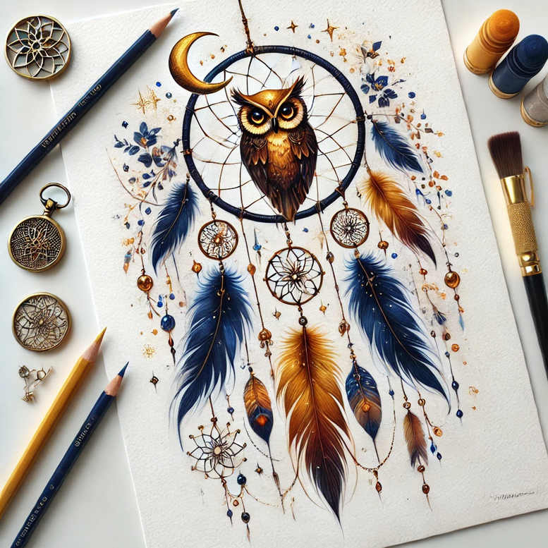 This AI-generated tattoo project presents a dreamcatcher motif featuring a vigilant owl at its heart, surrounded by flowing blue and amber feathers, scattered beads, a crescent moon, and tiny stars. The central hoop forms a meticulous circular frame, with a delicate web rendered in fine linework that breathes through soft watercolor washes. The owl’s plumage uses warm browns and gold highlights to convey wisdom and guardianship, while the feathers inject contrast with cool blues and warm oranges, creating a dynamic, eye-catching palette. Beads and tassels trace the strings, adding rhythm and a sense of motion as if the talisman were gently swayed by wind. Symbolically, the dreamcatcher is a protective emblem meant to filter dreams, while the owl embodies watchfulness and guidance through darkness; the moon and stars reinforce nocturnal vigilance, and the overall composition nods to nature-inspired themes within a contemporary tattoo design language. The piece leans toward a realistic yet painterly interpretation, suitable for a larger canvas such as a back or shoulder piece, yet remains legible as a smaller forearm tattoo when executed with appropriate line weight. The watercolor technique allows for soft transitions between hues, yielding depth in the owl’s plumage and texture in the feather barbs, while the beadwork and strings provide intricate detail that rewards close inspection. From a craft perspective, this design blends traditional dreamcatcher symbolism with modern tattoo artistry, offering a meaningful tattoo design option for those seeking symbolism—protection, wisdom, and guidance—expressed through a refined color story and precise linework. As an AI-generated tattoo project, it demonstrates current approaches to concept-to-ink workflow, balancing clarity with expressive flair. For cover-up considerations, the darker outer elements can be emphasized or adjusted to mask existing imagery while preserving a strong focal point on the owl and dreamcatcher; the composition remains adaptable to color translation or a black-and-grey rendition should the client prefer a subtler look.