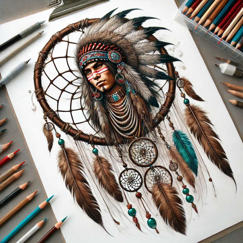 AI-generated tattoo project: this highly detailed colored illustration presents a dreamcatcher integrated with a Native American headdress. The circular web anchors a cascade of long, tapered feathers, while a beaded fringe and turquoise accents frame a central portrait. The headband is richly patterned with native-inspired patterns and conchos echoing traditional jewelry. The face beneath the headdress carries a calm, contemplative expression, enhanced by subtle shading and refined linework that convey depth and realism. The piece employs fine-line tattoo technique to render delicate feather barbs, thread-like beads, and the knotwork of the dreamcatcher, with smooth gradients that transition across skin tones to suggest a tattoo-ready surface. The composition balances bold silhouettes with intricate detail, allowing it to translate well as a large back or chest piece or as a standalone forearm design in a reduced scale. In the context of tattoo design, this concept embraces motifs such as dreamcatchers, feathers, beads, and headband jewelry to convey meaning: protection, strength, and cultural homage. The color palette leans toward rich earth tones and turquoise, producing vibrant contrast against lighter skin tones, while black ink outlines provide crisp definition for lasting ink. This AI-generated tattoo project demonstrates a professional concept piece for custom tattoo design and shows how such imagery can be adapted to black and grey or translated into a realistic tattoo, body art, and ink. For readers seeking meaningful tattoos, the image exemplifies how fine-line tattoo approaches can align with tribal and Japanese style influences, offering a versatile design suitable for small tattoos or expansive body art, with potential to incorporate lotus flower tattoo or rose tattoo design motifs if desired.