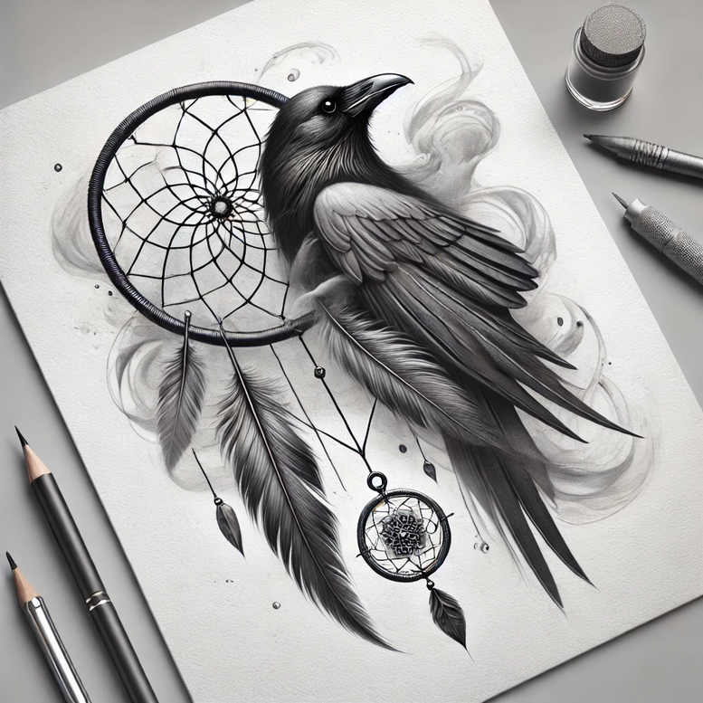 AI-generated tattoo project concept rendered in graphite-inspired black and grey shading, this piece pairs a stoic raven with a suspended dreamcatcher, weaving fauna and symbolism into a single cohesive tattoo design. The raven, rendered in a highly detailed, photorealistic approach, sits atop the circular web, its feathers layered with precise line work and soft gradations that convey texture and movement. The dreamcatcher web is meticulously traced, with a central bead and an outer ring delicately shaded to create depth, while lines and wispy threads hang from the ring, each feather defined by barbs and micro-shading to capture sheen and breath. The composition balances negative space with dense shadow where the raven’s body overlaps the web, making the figure pop against the wearer’s skin. The dreamcatcher’s web pattern is rendered with precise geometry to convey structure. This concept emphasizes cover-up potential: the bold blacks and strong shading can obscure prior ink while preserving essential detail in the raven’s eye and the dreamcatcher’s weave. The symbolism blends transformation and protection: the raven as guide through change, the dreamcatcher as a talisman to filter dreams, while the feather plumes imply movement and life. The technique leans toward realistic rendering in black and grey, with emphasis on contrast, texture, and subtle cross-hatching to render the freshness of feather down and the smooth, glassy surfaces of beads. Being an AI-generated tattoo project, it should be treated as a design study rather than a finished tattoo; a skilled artist would adjust proportions, line weight, and shading to suit anatomy, skin tone, and placement, and could incorporate additional motifs such as lotus flower tattoo or tribal elements if desired. The piece is well-suited for a forearm or upper back panel, where the raven’s gaze anchors the composition and the dreamcatcher provides a circular frame inviting further small motifs like blossoms or runic accents, while maintaining readability at smaller sizes. In the broader context of tattoo art, this design merges influences from Japanese style tattoo sensibilities with North American symbolism and translates them through a modern realistic approach, delivering a meaningful tattoo design that stands as a bold black and grey statement piece with refined line work, texture, and atmosphere, ideal for those seeking meaningful tattoos, fine line tattoo finesse, and a contemporary ink profile that remains versatile across placements.