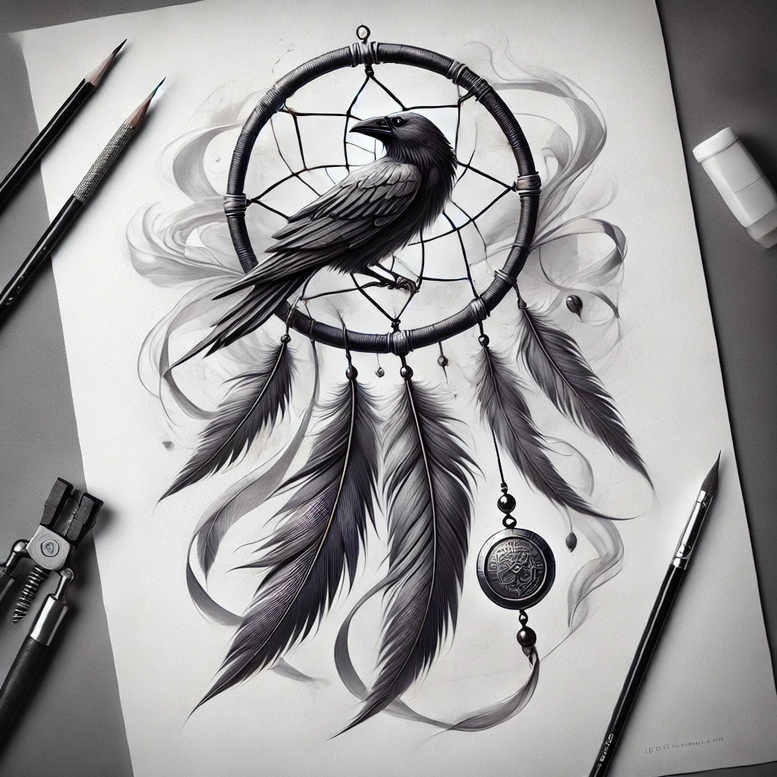 This AI-generated tattoo project concept presents a highly detailed raven perched within a circular dreamcatcher, rendered in black and grey with precise line work and subtle shading that mimic real skin textures and fabric wraps. The raven, shown in full profile, carries a keen gaze and sleek plumage, its feathers flowing around the ring as if stirred by a breeze, while the dreamcatcher web forms a geometric pattern that anchors the composition and suggests protection and prophecy. From the ring hang elongated feathers, each rendered with gradual tonal shifts and delicate striations to convey weight and movement, and a small ornate medallion on a beaded chain completes the focal point with a touch of mysticism. The overall design balances bold black areas with fine-line detail, enabling graceful scaling from forearm to back and making it a versatile option for a cover-up if prior ink needs camouflage due to density or darkness. As a modern tattoo design, it fuses traditional dreamcatcher symbolism with avian grace to evoke protection, intelligence, transformation, and the journey from shadow to light. The pattern-based motif—dreamcatcher web and fluttering plumes—translates well into tattoo form as a standalone piece or as part of a larger sleeve or body art composition. For those seeking meaningful tattoos, this black and grey tattoo design emphasizes timeless appeal, versatility, and ink longevity, and its strong silhouette supports both small tattoos and ambitious, high-contrast body art projects. This AI-generated tattoo project demonstrates how precise line work and textured shading can yield a realistic tattoo appearance on skin, while inviting customization toward Japanese style tattoo, tribal elements, or floral alternatives such as a lotus flower tattoo or rose tattoo design, to suit personal symbolism, meaning, and style preferences. In essence, it combines classic tattoo design vocabulary with contemporary realism to produce meaningful tattoos that resonate as both art and identity, and it remains an excellent option for anyone considering a cover-up or a striking, durable piece that honors tradition while embracing modern ink techniques.