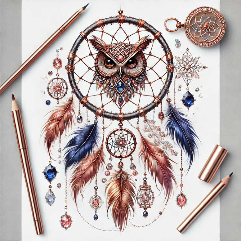 This piece is an AI-generated tattoo project concept presented as a vibrant dreamcatcher motif featuring an attentive owl at its center. Rendered in color with copper-gold lines, the hoop hosts a delicate web that forms a complex circular pattern, from which blue and pink feathers cascade in graceful arcs. Jewel tones—blue, pink, and clear crystals—adorn the strings and pendants, while a central pendant hangs beneath the dreamcatcher, adding a focal point that draws the eye along the design. The graphic treatment emphasizes fine line work and meticulous shading, producing a luminous, jewel-like quality that reads well as a tattoo design. Symbolically, the dreamcatcher serves as a protective talisman, the owl embodies wisdom and perception, and the flutter of feathers suggests freedom and momentum. The piece balances structure and spontaneity: the circular frame offers symmetry and rhythm, while the dangling beads and gem clusters introduce organic variety. The visible pencil and paper in the background reinforce this as a studio concept—an idea in progress that can be scaled to larger canvases or adapted for smaller runs of fine line work. From a technical standpoint, the illustration leans into a realistic yet stylized approach, where highlights on crystals mimic cut facets and the feathers gain depth through layered washes. As a tattoo concept, it accommodates a range of placements, from forearm to shoulder, provided line density is adjusted for legibility. In the broader landscape of tattoo design, this piece aligns with trends in fine line tattoo and colorful, symbolic motifs, offering a meaningful tattoo design that can be customized further with additional elements or language in the ink. This is an AI-generated tattoo project concept that melds fantasy illustration with practical tattoo considerations, inviting a client to translate the dreamlike pattern into a bespoke body art piece, while keeping in mind keywords such as tattoo, ink, black and grey alternatives, and the potential for a small or large format.