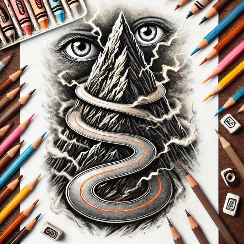 An intricate, high-contrast tattoo concept rendered in black and grey, this piece centers on a jagged mountain peak from which a sweeping snake climbs in a sinuous ribbon. The composition emphasizes the mountain’s serrated spine, its crevices defined with dense shading and crisp negative space to create a dramatic focal point, while a serpentine band coils from base to summit, its smooth curves contrasting with the angular rock and punctuated by a pale orange inner edge that suggests motion and energy. In the background, two wide-set eyes emerge from the shadows, giving the piece a watchful presence and adding symbolism of perception, protection, and inner vision. The outer frame is suggested by pencils and drawing tools arranged around the sheet, reinforcing the artwork’s origin as a hand-crafted tattoo design concept. The overall effect blends realism and stylized line work, suitable for a larger piece or a bold forearm sleeve, with emphasis on black and grey shading, fine line details, and careful gradient transitions that preserve clarity as the ink settles. This AI-generated tattoo project demonstrates how classic motifs—mountain, snake, eyes—can be fused into a cohesive narrative about resilience, transformation, and ascent through challenge. For cover-up purposes, the dense black shading and layering provide ample masking potential for prior tattoos, and the tight line work ensures crisp edges that hold over time. Symbolically, the mountain represents steadfastness and inner strength, the snake embodies renewal, the eyes indicate insight, and the pencils hint at creativity and process. The design nods to a restrained Japanese-influenced sensibility through measured line weight while remaining accessible as a modern black and grey piece suitable for a broad range of skin tones. Keywords associated with this design include tattoo, tattoo design, meaningful tattoos, fine line tattoo, mountain tattoo, snake tattoo design, black and grey, realistic tattoo, body art, ink, and custom tattoo design.