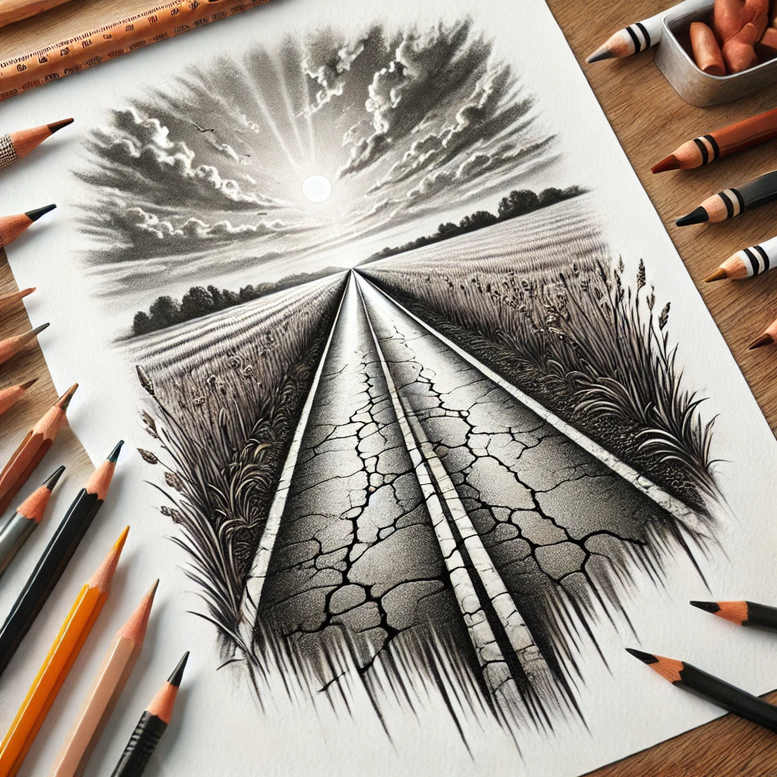 An AI-generated concept presented as a monochrome pencil sketch of a long, cracked road stretching toward a pale sunrise. The perspective is driven by converging lines that vanish on the horizon, while the fields and tall grasses flare outward along the roadside, creating a dynamic frame that guides the eye to the center. The sky is rendered with soft gradients and wispy clouds, contrasting with the sharp, jagged crack patterns that dissect the road surface. The technique relies on graphite shading, cross-hatching, and textured stippling to achieve a realistic texture read as a tattoo design when inked in black and grey. This concept balances bold, solid areas with fine line details, ensuring legibility from a distance while preserving subtle texture up close. The road’s cracks symbolize obstacles overcome and journeys undertaken; the sun evokes renewal, and the surrounding fields stand for growth and potential. The composition is adaptable to forearm, upper arm, back, or calf, with room to adjust scale and placement. As a custom tattoo design, it leverages strong contrast and a graphic pattern that remains clear under different lighting conditions, while offering the option to enhance grasses with additional line work or stippled texture. This is an AI-generated tattoo project exploring a modern approach to monochrome realism, blending traditional illustration techniques with tattoo-ready proportions and spacing. Included keywords for discoverability include tattoo, tattoo design, meaningful tattoos, fine line tattoo, road tattoo, black and grey, realistic tattoo, pattern, cover-up, and ink, and the overall goal is a piece that can function both as a standalone artwork and a cover-up concept when needed.