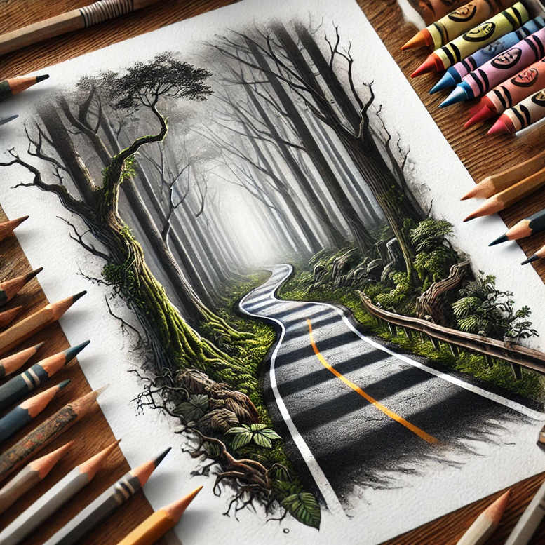 An AI-generated tattoo project depicting a winding road threading through a mist-shrouded forest, rendered in a sophisticated black-and-grey palette. The composition relies on realism and atmospheric shading, with a glossy asphalt ribbon that snakes from the foreground toward a pale vanishing point where light filters between trunks. A thin center line offers a subtle accent in an otherwise monochrome scheme, suggesting motion and purpose while keeping the design ideal for black-and-grey ink. On either side, ancient trunks rise with twisted limbs and sparse foliage, their bark rendered with fine-line texture and soft gradients to convey depth. A weathered guardrail along the roadside curves with the path, while moss and low-lying rocks crowd the verges, adding organic texture that contrasts the road’s smooth surface. Mist between trunks softens the scene, creating negative space that enhances legibility for tattoo canvases such as the back, chest, or sleeve. Symbolically, the road can signify journey, transformation, and personal meaning, while the forest hints at mystery and resilience. For tattoo practitioners, this design offers a strong, coherent flow that scales to different body areas; lines are clear for bold, readable tattoos and delicate enough for fine-line work and shading gradients typical of high-quality ink. The concept supports meaningful tattoos and can be adapted toward Japanese style tattoo, tribal tattoo, or black-and-grey realism, depending on client preference. If the aim is a cover-up, the dense tree silhouettes and dark tones provide ample coverage over older ink, while the road remains the focal motif to preserve movement and narrative. This piece demonstrates how a dark, atmospheric forest landscape translates into professional tattoo design and body art, where thoughtful line weight, negative space, and texture create a timeless statement.