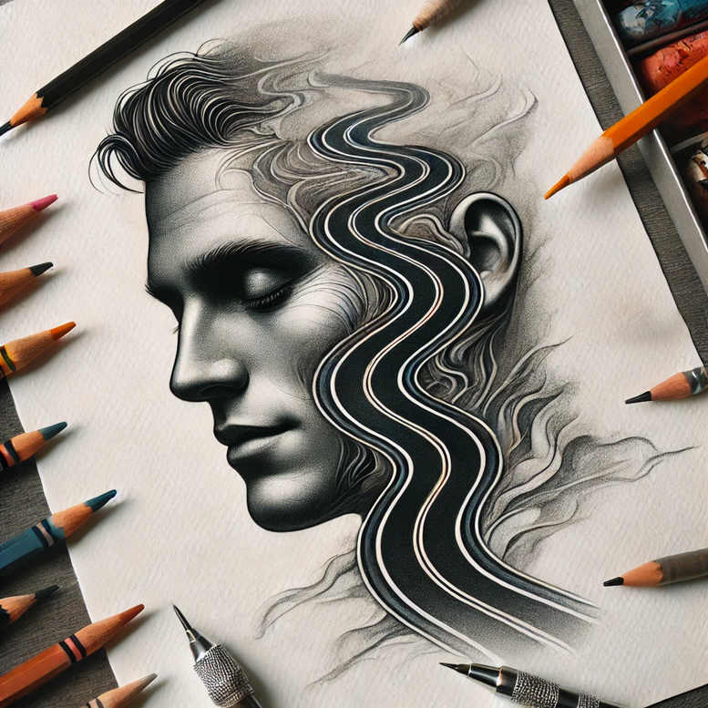 AI-generated tattoo project concept presented as a refined black and grey portrait that fuses classic figurative shading with a contemporary wave pattern. The central motif is a woman’s profile, rendered in smooth, tonal grayscale that captures soft transitions from light to shadow across the cheek, forehead, and nose. The hair flows into a rhythmic, serpentine ribbon of lines that winds along the side of the face, composed of parallel strands with crisp white highlights, creating a striking pattern that blends realism with graphic elegance. The overall composition sits on a plain surface, with pencils and drawing tools encircling the design, underscoring its status as a tattoo design concept rather than a finished piece. The technique emphasizes fine line work, subtle cross-hatching, and gradient shading to achieve a realistic black and grey look while maintaining readability as a tattoo. The pattern-like hair weave provides a bold visual motif that can be incorporated into a sleeve or across a shoulder blade, offering possibilities for scale and placement. In terms of symbolism, the portrait can symbolize inner flow, balance, and the intertwining of strength and grace; the wave motif evokes movement, life cycles, and continuity. For clients seeking meaningful tattoos, this design blends classical portraiture with modern pattern elements, making it suitable as a refined, timeless tattoo design. Implementation-wise, the image exemplifies techniques common to fine line tattoo, black and grey realism, and geometric-esque pattern integration, with potential adaptations into Japanese style tattoo or floral themes if desired. While this is an AI-generated tattoo project concept, it demonstrates how clean lines and subtle shading can create a sophisticated body art piece that reads well in small tattoo sizes while preserving detail in larger formats.