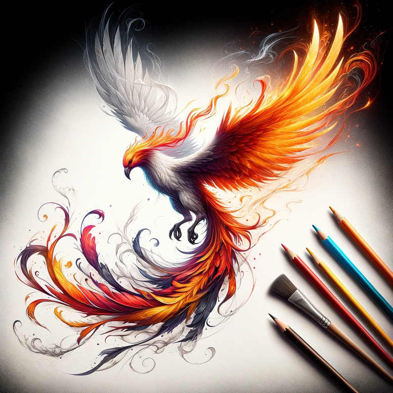 This AI-generated tattoo project concept presents a vibrant phoenix tattoo design rendered in a dynamic watercolor style. The main motif is a phoenix with sweeping, flame-like plumage in a spectrum of orange, red, yellow, and cooler blue accents, set against a clean white background. The bird’s wings swirl in an energetic curve, with feather details that resemble painterly brushstrokes, while wisps of ink-like line work add movement and depth. Visible tools—brush and pencil—hint at the original sketching and color planning that underpins a custom tattoo design, signaling a bridge between artwork and inking. The composition reads as a large, imposing centerpiece that could wrap gracefully around the shoulder, arm, or back, and its bold color palette ensures strong visibility in a tattoo context. Symbolically, the phoenix stands for rebirth, resilience, and renewal, making this a meaningful tattoo design for someone undergoing personal transformation. The piece emphasizes color and form over photorealism, balancing fluid gradients with sharp silhouette to achieve a modern, expressive style that sits well within contemporary body art trends, including black and grey alternatives if desired. For enthusiasts and clients, this concept demonstrates how watercolor-inspired ink translates into lasting body art, preserving motion and vibrancy in a tattoo design that feels both timeless and current. As an AI-generated tattoo project concept, it highlights the potential of digital-era collaboration to refine motifs, scales, and color blocking before inking, while remaining adaptable to different skin tones and sizes. The reference language across the description aligns with tattoo industry terminology, embracing keywords such as tattoo, tattoo design, meaningful tattoos, fine line tattoo, lotus flower tattoo, infinity tattoo, tribal tattoo, rose tattoo design, small tattoos, flower tattoos, custom tattoo design, Japanese style tattoo, black and grey, realistic tattoo, body art, ink, ensuring discoverability for readers seeking inspiration and guidance.