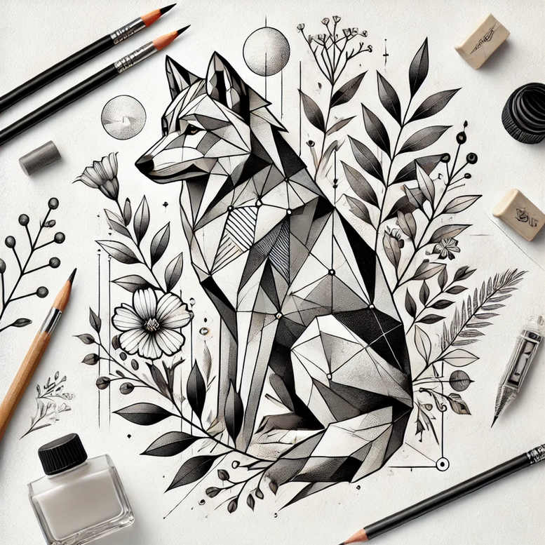 AI-generated tattoo project concept presenting a geometric wolf sculpted from interlocking facets, surrounded by botanical elements. The wolf is rendered in black and grey with crisp, origami-like planes that create depth through shading while a ring of leaves and flowers threads through the composition to soften the silhouette. The pattern-heavy design relies on a lattice of triangles and angular lines that define the beast’s form and invite the eye to follow the facets from edge to edge. Botanical accents function as a natural counterpoint, reinforcing themes of growth, renewal, and resilience, and offering a versatile canvas for placement on the arm, shoulder, or back. Technically, the piece blends solid black ink blocks with smooth grey gradients, tight linework, and careful negative space to achieve high-contrast detail that remains durable on skin. The contrast between geometry and nature makes this a bold yet refined tattoo design, capable of standing alone or serving as a dramatic cover-up thanks to its dense dark areas and adaptable shading. Symbolically, the wolf embodies guardianship, strength, and loyalty, while the flowers and leaves signify transformation and vitality—a narrative suitable for meaningful tattoos and small-to-medium body placements. For tattoo enthusiasts, this concept aligns with trends in fine line tattoo, geometric tattoo, and black and grey ink, while remaining flexible as a custom tattoo design that can be adjusted in scale and placement. Finally, note that this is an AI-generated tattoo project concept created to spark ideas for clients and artists, and it demonstrates how AI can influence modern body art while still delivering a heartfelt, ink-ready tattoo design.