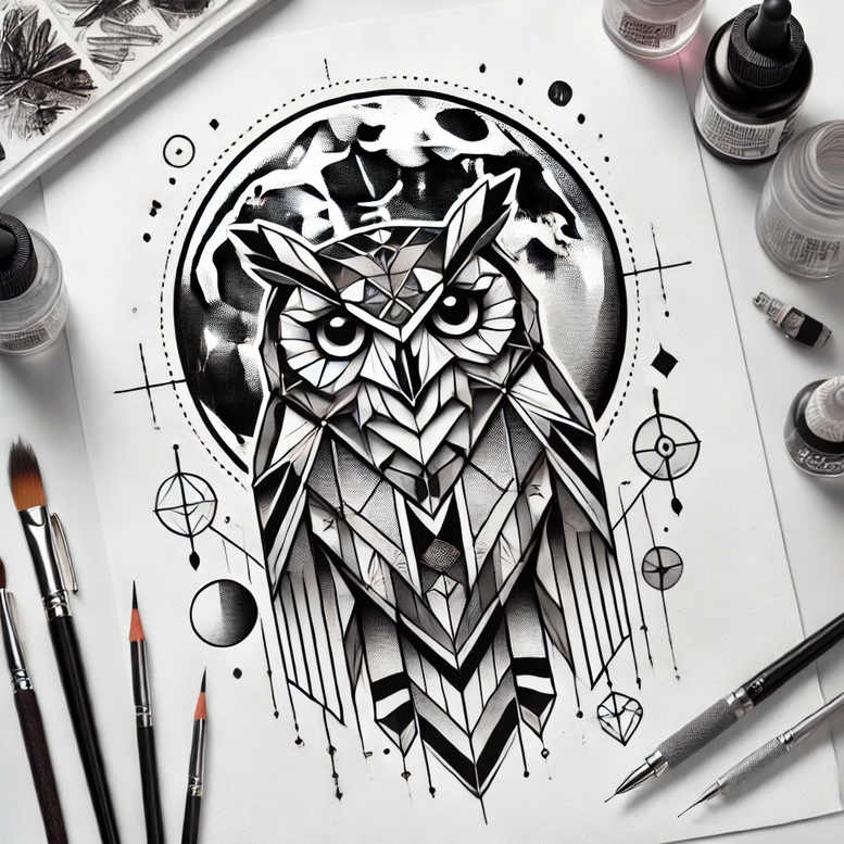 This geometric owl tattoo design is rendered in a precise black-and-grey palette, combining polygonal facets with clean line work. The central owl is built from interlocking triangles and chevrons that converge toward piercing eyes, giving the creature an alert, intelligent presence. A circular moon motif sits behind the head, with subtle rings and scattered geometric marks that echo the rest of the piece. The lower portion tumbles into elongated chevron plumes, creating an abstract fringe that adds motion and balance to the composition. The overall effect blends tribal and Japanese-inspired influences with contemporary fine-line and geometric tattoo aesthetics. The design embraces negative space and dense shading to achieve depth without color, making it ideal for black and grey ink. The pattern-driven construction invites versatility: it can be scaled for a forearm sleeve, chest piece, or back, and can be adapted as a cover-up thanks to large, solid dark areas that can mask prior tattoos. This image is an AI-generated tattoo project concept, illustrating how algorithmic precision translates into body art. In terms of meaning, the owl symbolizes wisdom and perception, while the circular moon and intersecting lines evoke cycles, balance, and the interplay between sight and intuition. The geometric facets suggest a modern reinterpretation of natural forms, appealing to collectors of meaningful tattoos who seek a bold, lasting impression. For practical placement, the piece works well as a statement forearm or back piece, and the stark black and grey palette aligns with classic tattoo design tropes while offering timeless appeal for people seeking a custom tattoo design with refined pattern work and strong line work. This concept showcases how fine-line tattoo artistry can translate into meaningful tattoos that celebrate ink as body art.