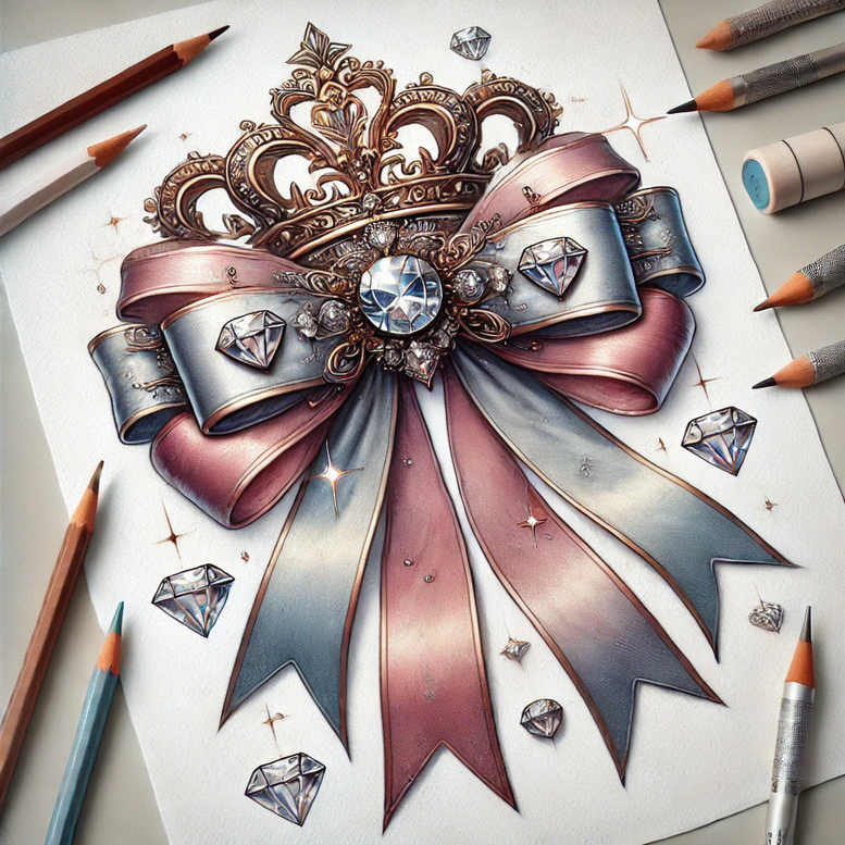This AI-generated tattoo project concept presents a highly decorative emblem: a regal crown centered on a two-tone ribbon bow tinted in soft pink and cool blue, with a central gem and multiple scattered diamonds that catch the light. The drawing emphasizes smooth gradients, crisp line work, and a glossy, jewel-like finish that would translate well to a color tattoo design. The crown features ornate filigree and a large central diamond, while the ribbon and bow tails cascade beneath, edged in fine lines to suggest folds, depth, and a subtle metallic sheen. Diamonds appear as inlays on the bow and as floating accents, reinforcing themes of clarity, value, and celebration. The surrounding frame includes a few colored pencils and an eraser, hinting at the design study origin—an idea ready to be refined into a final tattoo. As an AI-generated concept, this piece showcases how digital illustration can seed meaningful tattoos for wearable body art, blending luxury ornamentation with contemporary techniques. In terms of symbolism, the crown denotes authority and achievement; the ribbon conveys movement and unity; the diamonds symbolize resilience and sparkle. The composition is adaptable: it could be realized in full color or reworked as a fine line tattoo for a delicate effect; it could also be translated into Japanese style tattoo concepts or realistic ink depending on the artist. This concept sits at the intersection of jewelry-inspired ink and floral motifs, offering a strong visual language for small-to-medium tattoos or as a cover-up test piece in broader sleeve or back designs. Technical notes for tattooers: use soft gradient shading to recreate the jewelled sheen, apply white highlights to diamond facets, and consider layering the bow in a slightly cool palette to keep the piece cohesive with skin tones. Additionally, the patterning of the diamonds provides opportunities for mosaic shading or crisp gemstone facets; the crown’s filigree can be rendered with fine line work or left as a bold silhouette for a modern take. For clients seeking a cover-up, the curved negative space around the bow can help mask smaller tattoos.