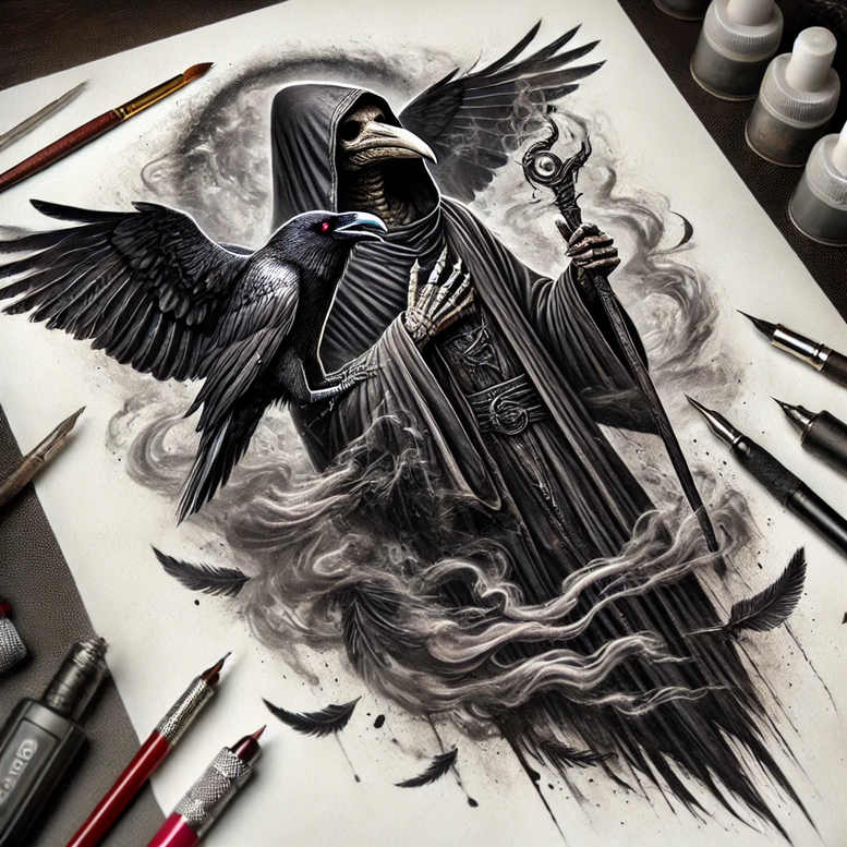 This is an AI-generated tattoo project depicting a dark, cinematic scene: a hooded grim reaper stands amid swirling smoke, a raven perched on the forearm while a carved staff rises beside. Rendered in black and grey, the design relies on nuanced gradations and precise line work to build volume across the cloak, skeletal hand, and feathered wings. The composition centers the reaper as a symbol of mortality and fate, with the raven serving as omen and messenger, and the staff providing a ritual focal point. The interplay of negative space and smoky swirls creates a cohesive atmosphere that blends realism with fantasy, ensuring legibility on both small and large canvases such as forearms, chests, or backs. The artwork employs subtle shading to achieve a painterly texture, while the raven’s gloss and the reaper’s hooded silhouette generate strong contrast for skin translation. Given the image’s darkness, it is an excellent candidate for a cover-up, ideal for someone seeking to reinterpret an old tattoo with a bold, new figure. The piece explores themes of transformation and memory, weaving a concise narrative of life, death, and rebirth through a single, powerful motif. In practice, this design translates well as a large monochrome tattoo with smooth grey washes and crisp black outlines; fine line details around the raven’s beak and wing tips add texture without compromising legibility across placements. As an AI-generated tattoo project, it demonstrates how digital artistry can inform traditional tattoo design, offering a versatile base for customization in symbolism, size, and placement. Keywords such as tattoo design, black and grey ink, meaningful tattoos, pattern-driven composition, and realistic tattoo permeate the concept, ensuring strong search performance and inspiration for clients seeking a dramatic statement piece.