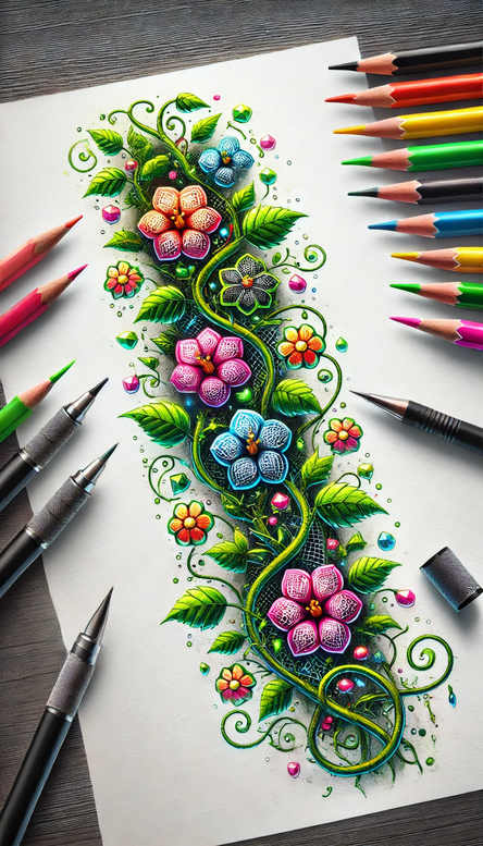 AI-generated tattoo project concept presented as a botanical scroll: a winding vine adorned with blossoms, leaves, and subtle gemstone accents, rendered in vivid color with a tactile pencil-like texture. The composition reads as a single continuous band that could wrap around an arm, wrist, or ankle, with blossoms in pink, purple, and blue tones, centers softly shaded for depth, and curling tendrils that anchor the design. The technique echoes colored pencil work on white paper, employing layered strokes to build luminous petals and glossy leaves while preserving a hand-drawn edge. The imagery suggests growth and renewal: vines symbolize connection and continuity, blossoms bring beauty and meaning, and the scattered gems evoke energy and sparkle. In a tattoo context the piece lends itself to a cover-friendly placement along a limb or torso, offering a bold, pattern-rich design that remains legible at smaller scales. While the palette is bright and saturated, the concept is adaptable to different skin tones and can be translated into a monochrome black and grey version for a more understated look, or expanded into a large sleeve motif. The design nods to modern botanical illustration and Japanese style tattoo motifs, while remaining a flexible, custom tattoo design suitable for small tattoos or larger commissions. For those seeking meaningful tattoos, this concept blends floral symbolism with a graphic rhythm, delivering a versatile starting point for tattoo design that can evolve into a fine line tattoo, flower tattoos, or tattoo designs emphasizing natural forms. As an AI-generated tattoo project concept, it showcases how ink can capture life’s energy through color, line, and motif, appealing to fans of flower tattoos, vine tattoos, and intricate pattern work across styles, including black and grey or vivid color strategies.